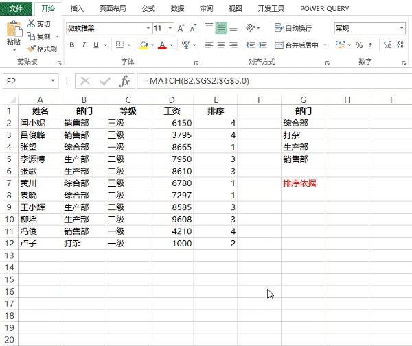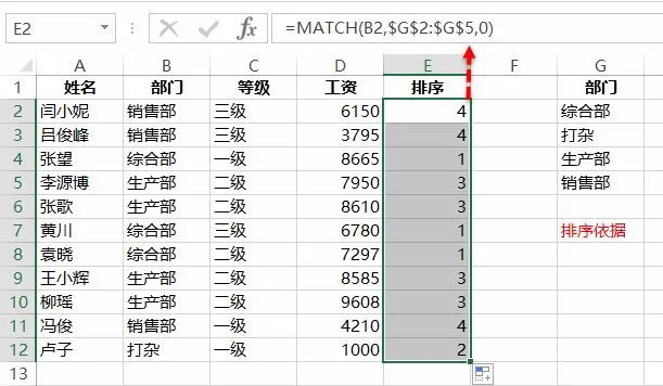 Step 01 在E2输入公式,下拉。这样就获得了每个部门的排位,比如打杂就排在第2位。