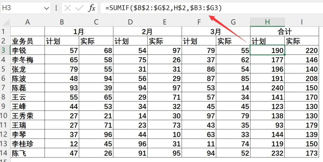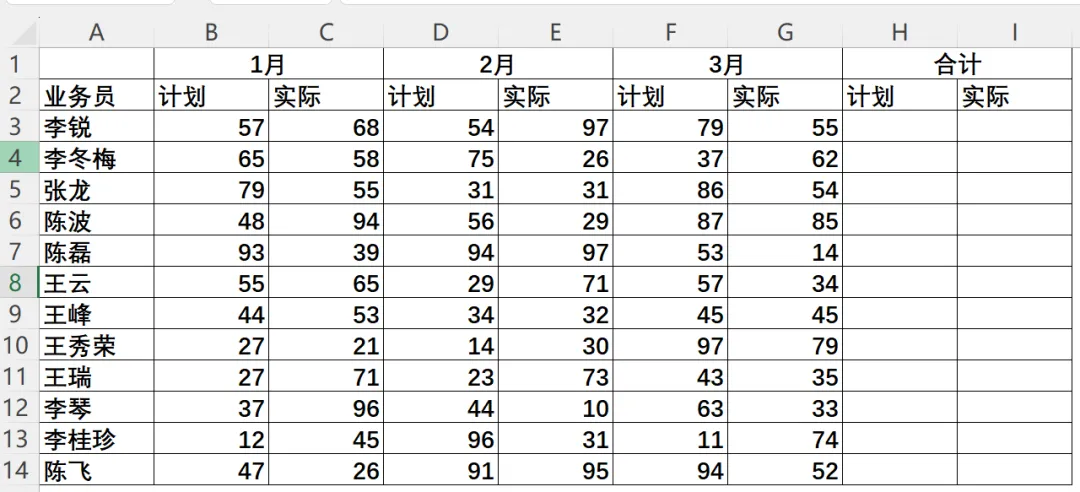 见下表,某企业要求对业务员的业绩完成情况按照计划和实际分别统计,要求在H列中统计所有月份的计划合计数,在I列中统计所有月份的实际合计数。