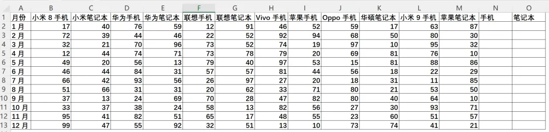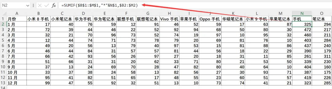 手机和笔记本在商品名称中都位于结尾位置,所以可以用通配符*实现条件参数的构建,再用SUMIF函数配合绝对引用和混合引用实现用一个公式统计多列数据。