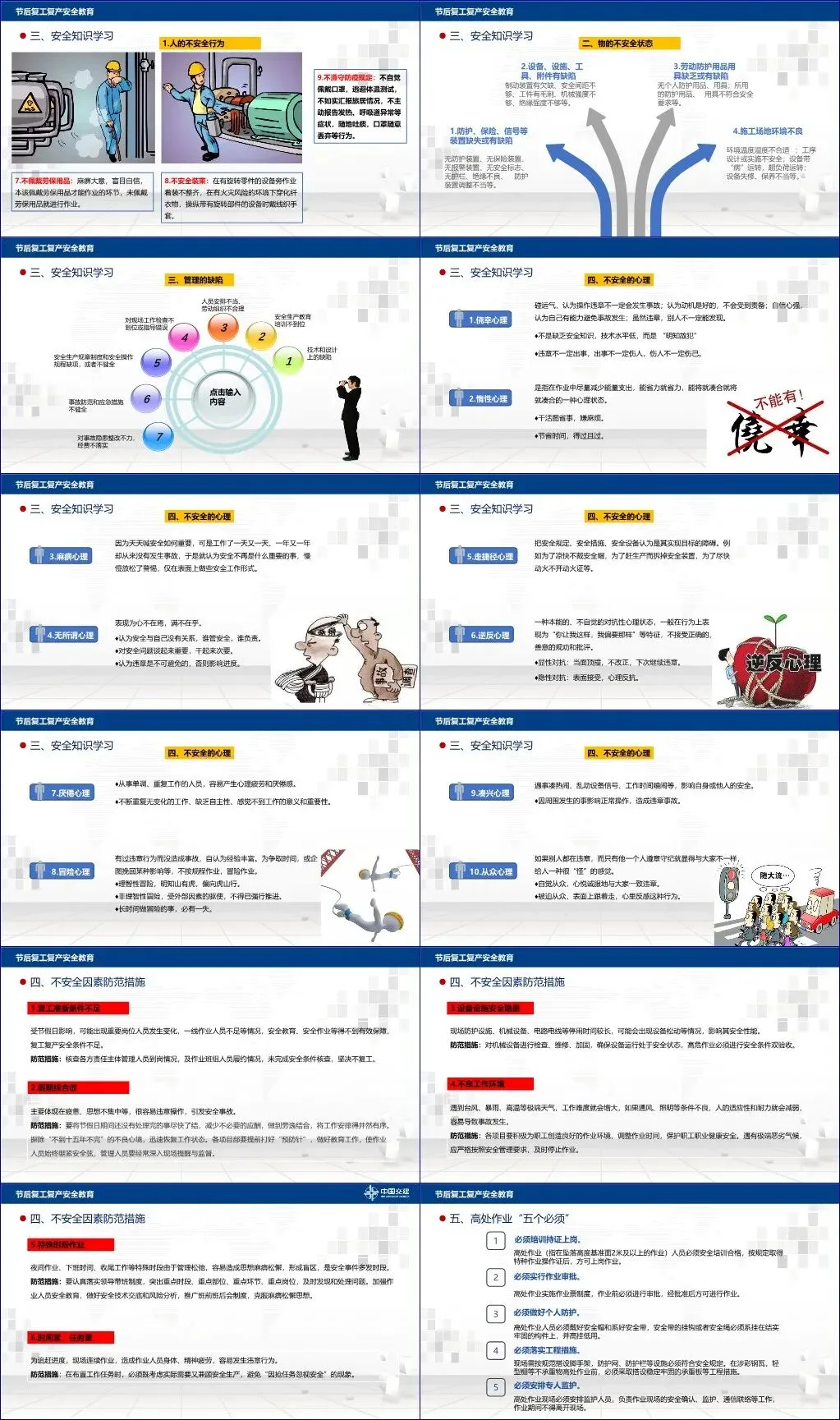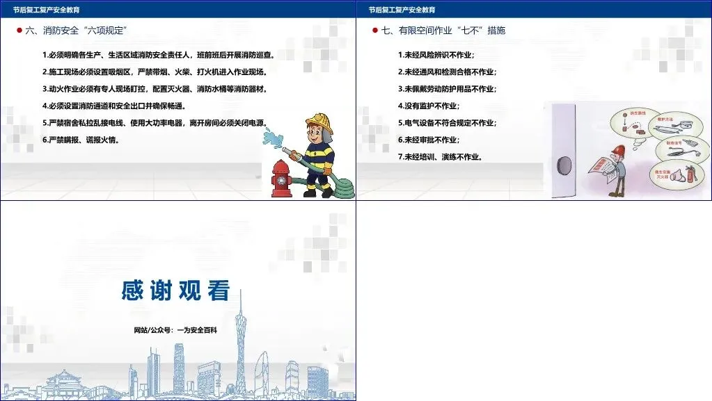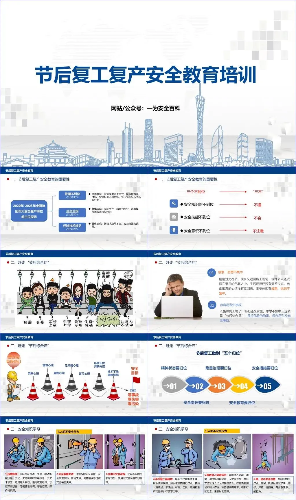 这篇PPT文档主要围绕节后复工复产的安全教育培训展开,旨在帮助企业和管理者识别复工期间的安全风险,克服“节后综合症”,并落实具体的安全防范措施。以下是详细内容总结: