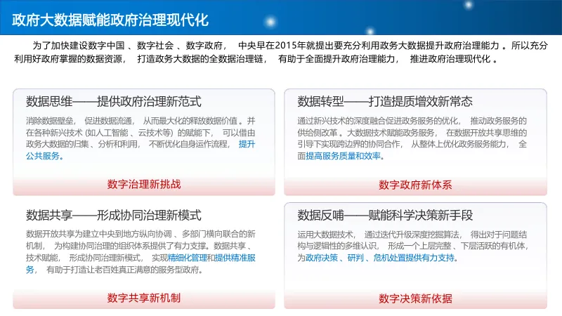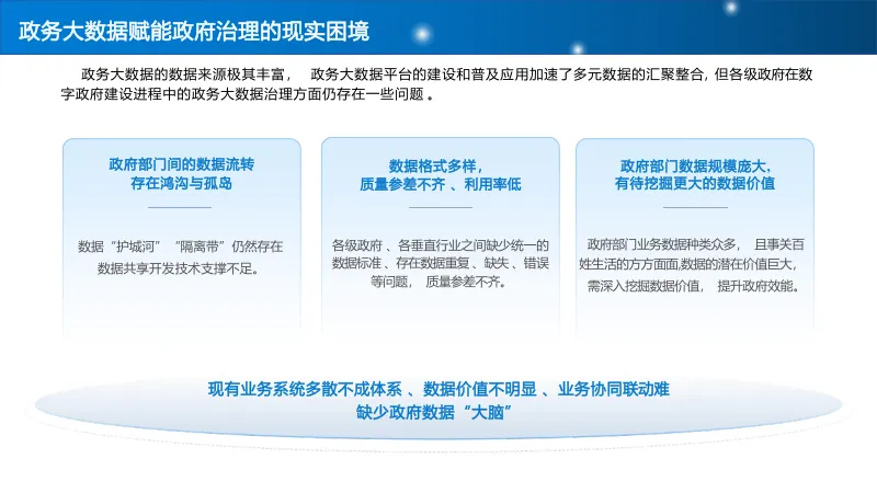 政府数据规模庞大、覆盖民生各领域,潜在价值巨大,但缺乏深度挖掘能力,数据对决策和服务的赋能作用未充分发挥。