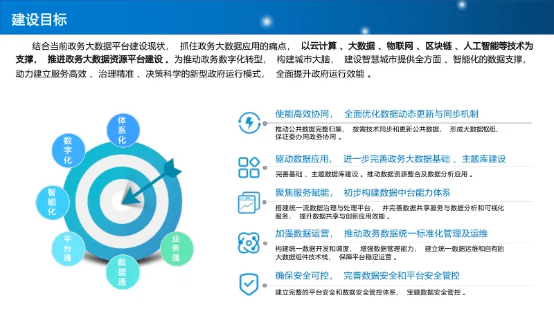 以云计算、区块链等技术为支撑,搭建 “数据通、平台通、业务通” 的一体化架构,健全安全管理、标准规范、运营管理体系,实现数据全生命周期管控,推动电子政务向智慧政务升级。