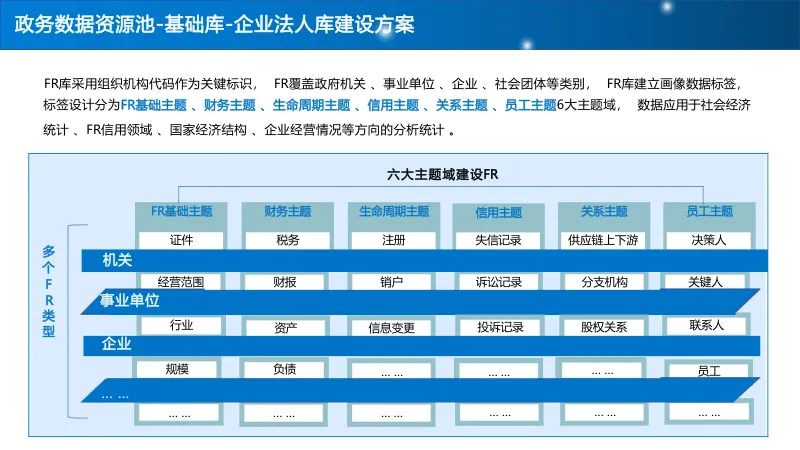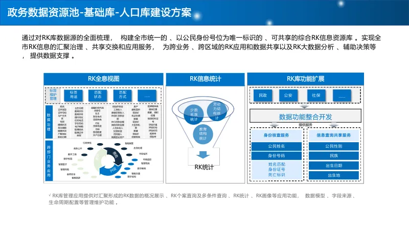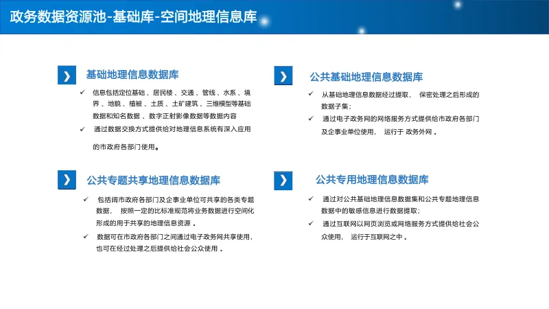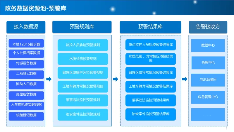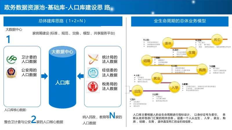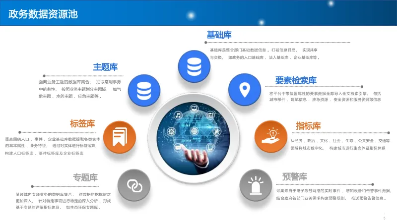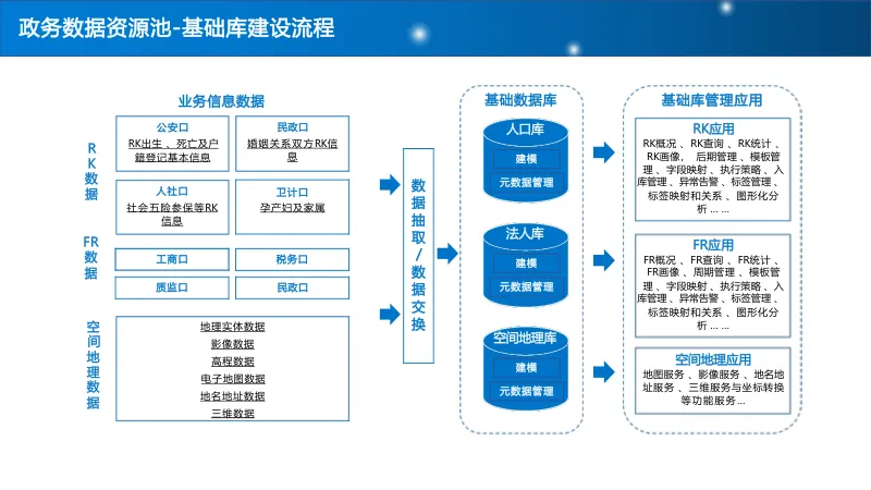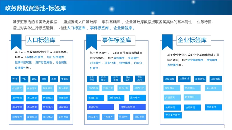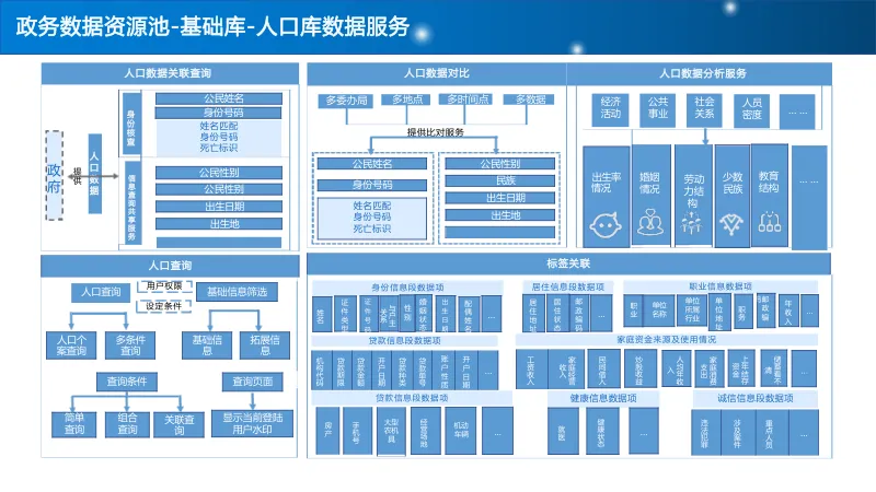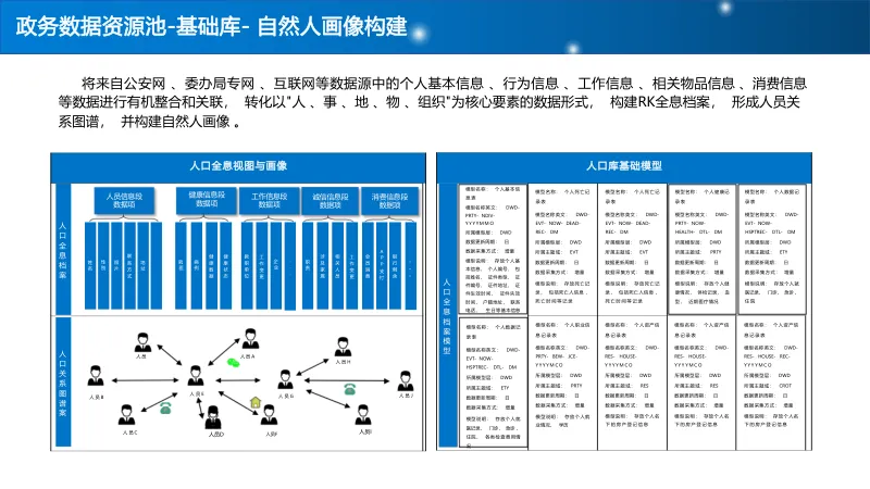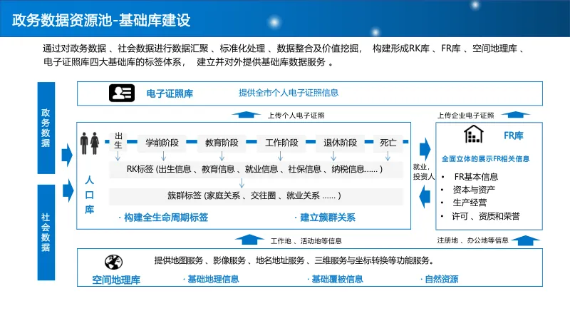 建设 “基础库 + 主题库 + 专题库” 多层级数据资源池,重点打造人口、法人、空间地理等基础库,构建标签体系与全息画像,结合 AI 算法实现多维分析,支撑科学决策与精准服务。
