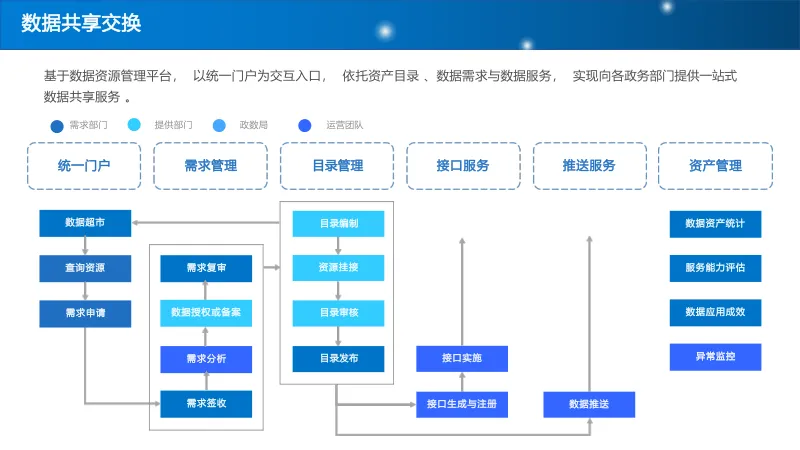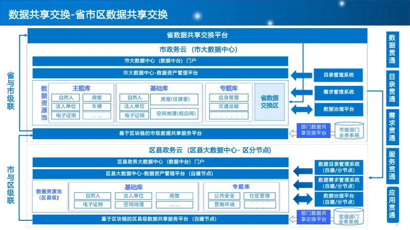 构建省市区三级数据共享交换平台,通过统一门户、目录编制、授权备案等流程,实现跨部门、跨层级数据贯通,建立纵向联动、横向协同的共享机制。