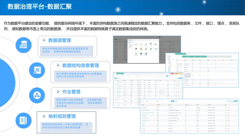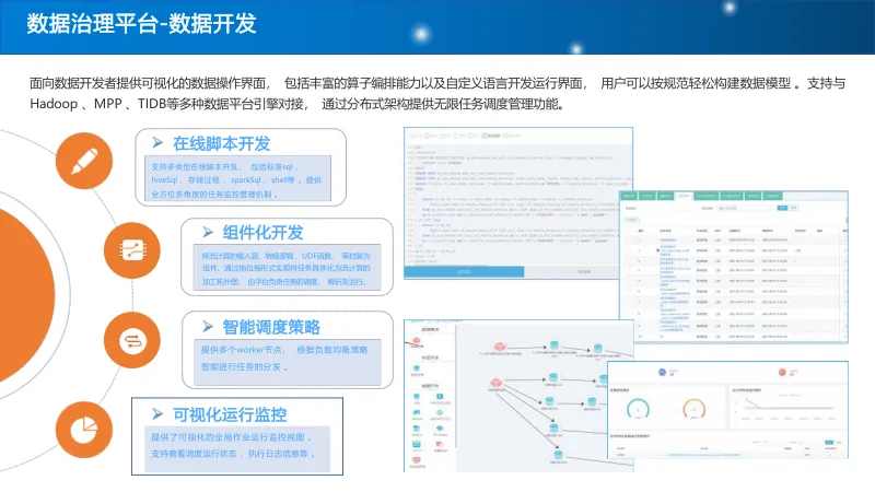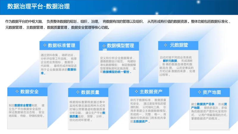 搭建统一数据治理平台,制定统一数据标准,通过元数据管理、数据血缘追踪、质量规则定义等功能,实现数据清洗、校验与标准化处理,保障数据可信可用。