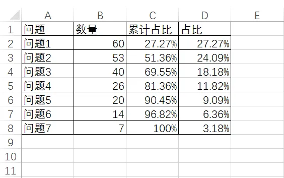 第一步、数据整理、统计问题的条数、以及问题在全部数据中的占比、其次对将数据按照比例大小从大到小排序、再次算出各个问题的累计占比、参考了如下: