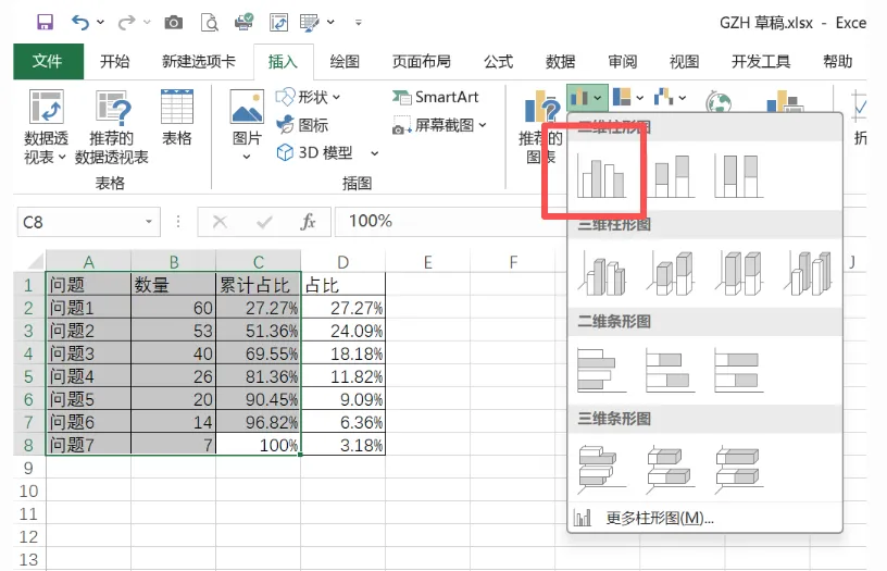第二步、插入图表、选中前三列、柱形图、