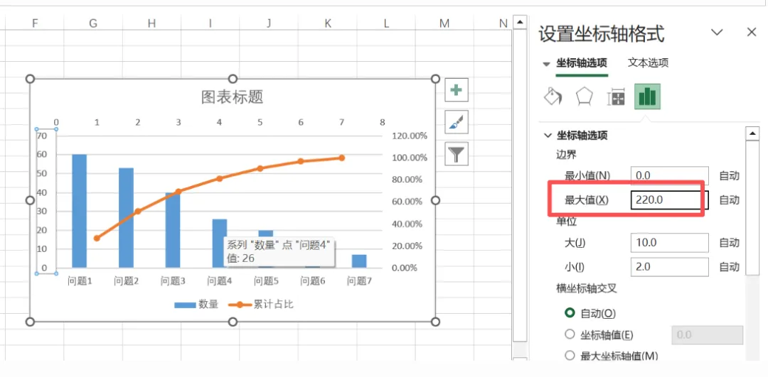 第四步、继续调整图表格式、选中主纵坐标,将其范围学者0-220,