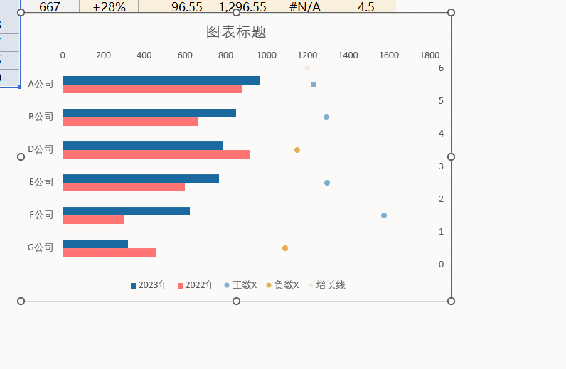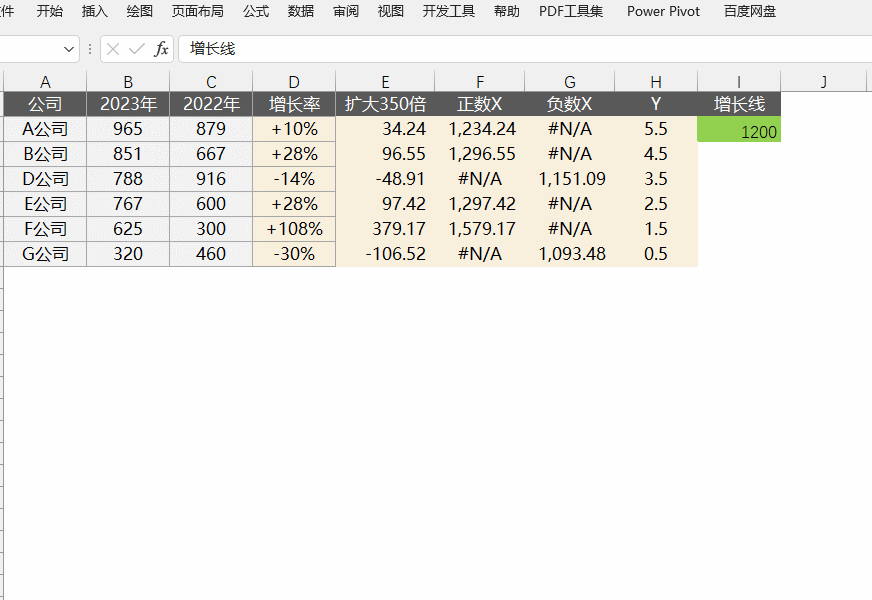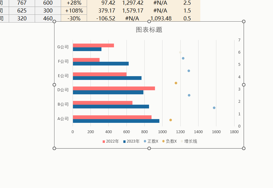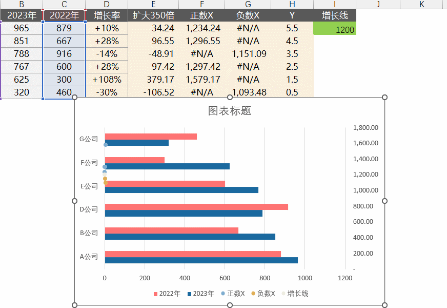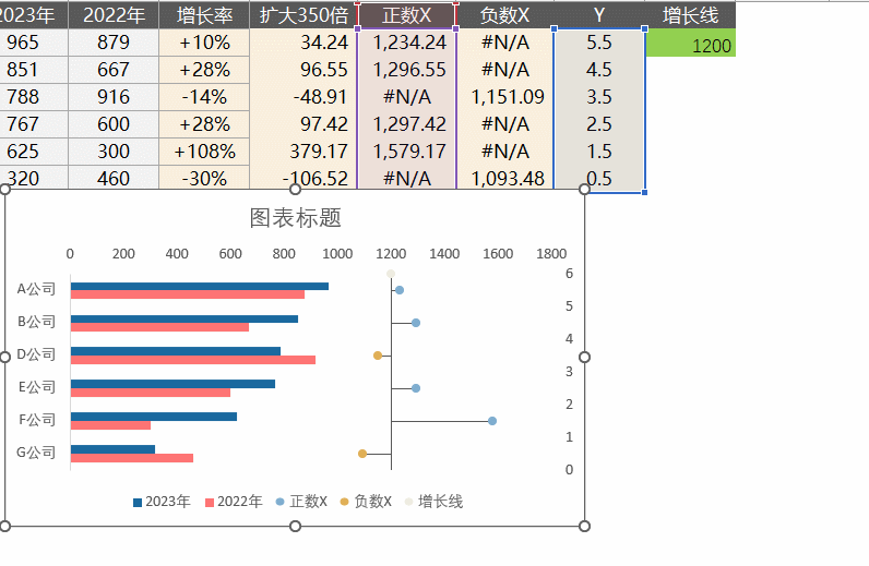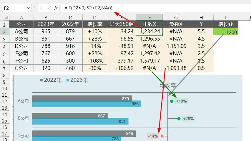 D列计算增长率,E列=D列*350(百分数太小了,扩大后才方便在图上显示)。F列和列获取正增长和负增长点的X值(G列公式=IF(D2<0,I$2+E2,NA())),I2的值1200是增长率线的位置(X值),可以根据条形图长短进行调整。
