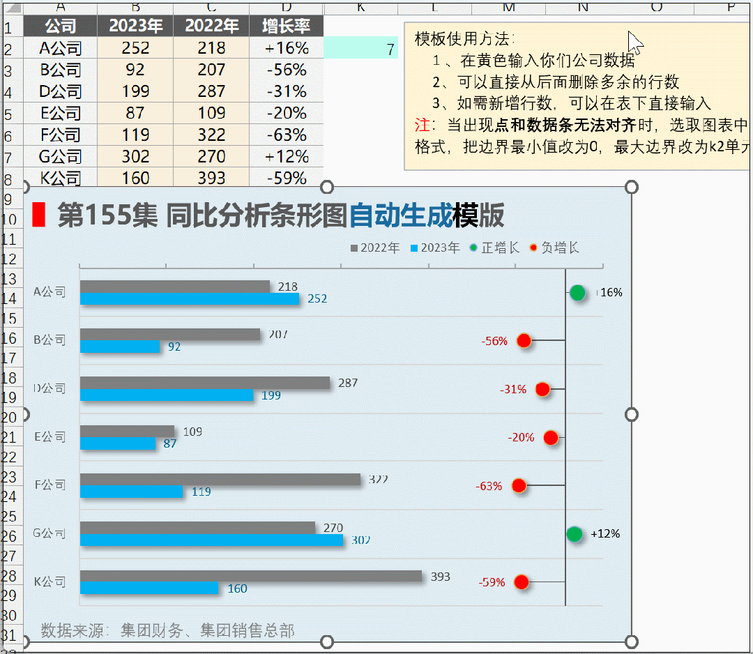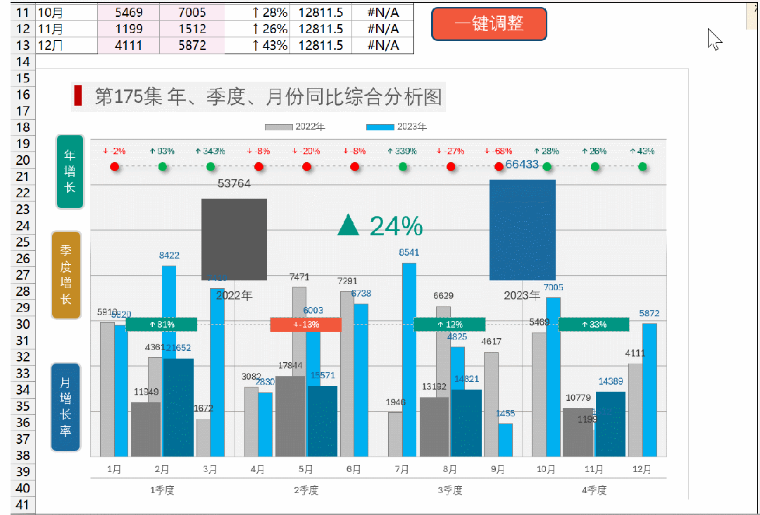 兰色说:其实,这种图还有可以有双坐标的做法,把增长率放在次坐标轴上,步骤可以简化很多,在兰色的图表课程第155集介绍了双坐标做法,只是单坐标做法的可扩展性更强,可以用次坐标显示更多内容。