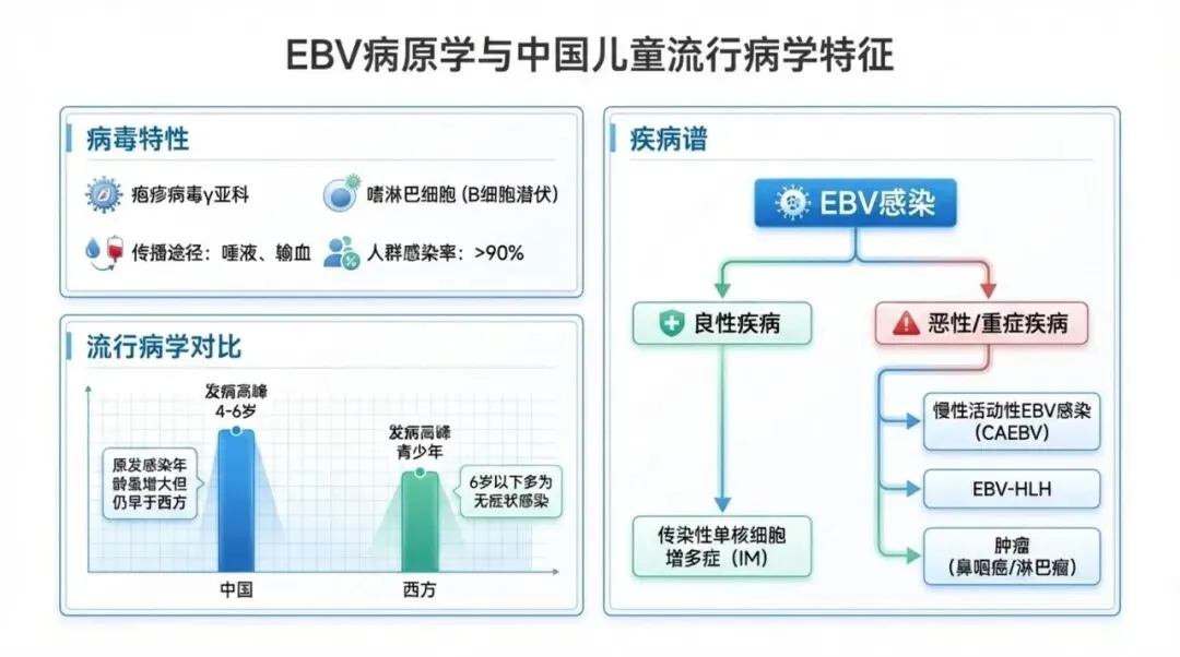 EB 病毒(Epstein‑Barr virus,EBV)是一种重要的肿瘤相关病毒,与部分鼻咽癌、胃癌和淋巴瘤等肿瘤性疾病的发生有关。EBV感染也可引起许多非肿瘤性疾病,如原发感染所致的传染性单核细胞增多症(infectious mononucleosis,IM),慢性活动性EBV感染(chronic activeEpstein‑Barr virus infection,CAEBV)以及EBV相关噬血细胞性淋巴组织细胞增生症(Epstein‑Barrvirus‑related hemophagocytic lymphohistiocytosis,EBV‑HLH)等,上述3种EBV感染相关疾病在儿童多见,严重危害儿童生命健康,但其诊治存在不规范,如诊断标准的可操作性欠佳、存在过度抗病毒治疗等。本文根据《儿童EB病毒感染相关疾病的诊断和治疗原则专家共识》制作课件,目标读者为各级儿科临床医师,仅供专业医务人员参考,可加微有偿获取完整课件wxkukakukal07。