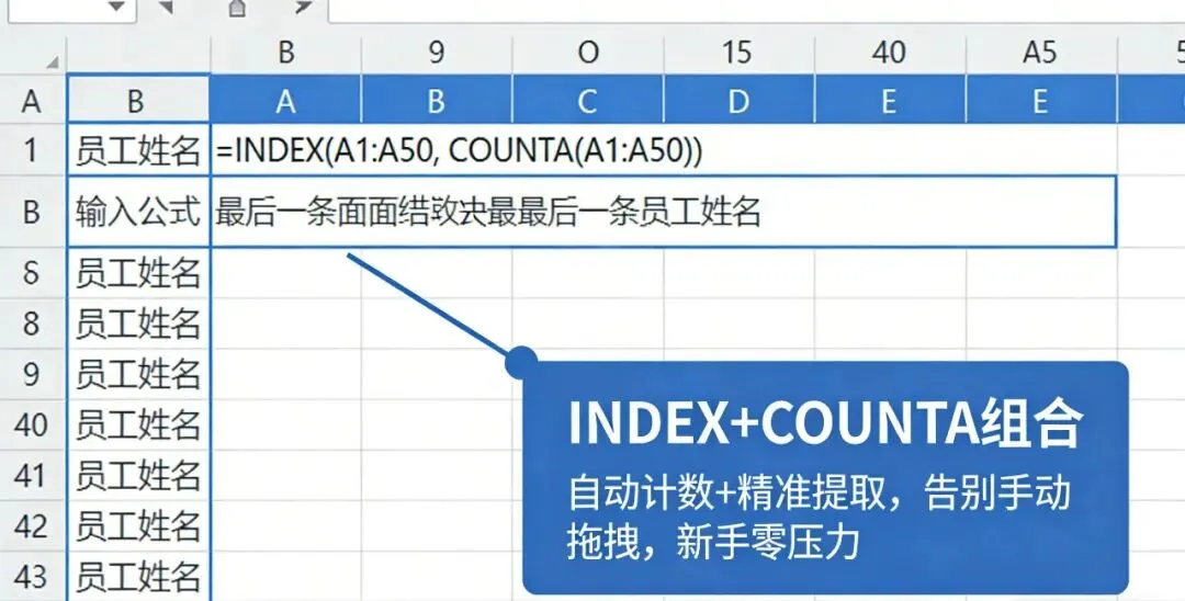 举个小例子:A1:A50是员工姓名(部分单元格为空,实际有效数据38条),输入公式=INDEX(A1:A50, COUNTA(A1:A50)),瞬间提取最后一条员工姓名;下拉填充公式,就能依次提取所有38条有效员工姓名,COUNTA自动统计有效行数,再也不用手动数、手动拖拽提取,效率直接翻倍!