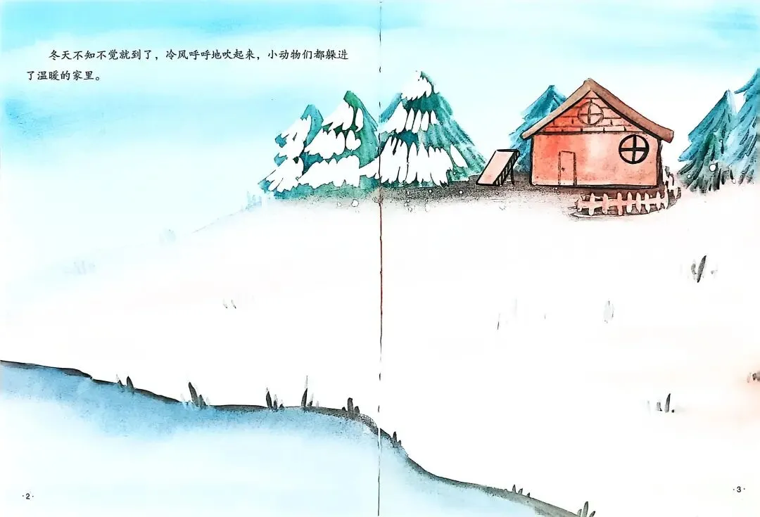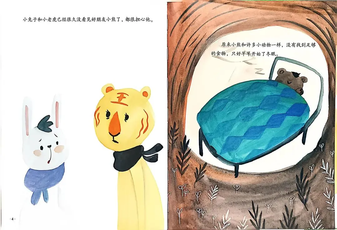 冬天不知不觉就到了,冷风呼呼的吹起来,小动物们都躲进了温暖的家里。 小兔子和小老虎已经很久没看见好朋友小熊了,都很担心他。
