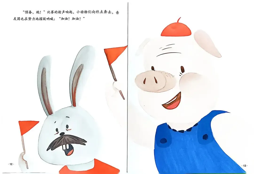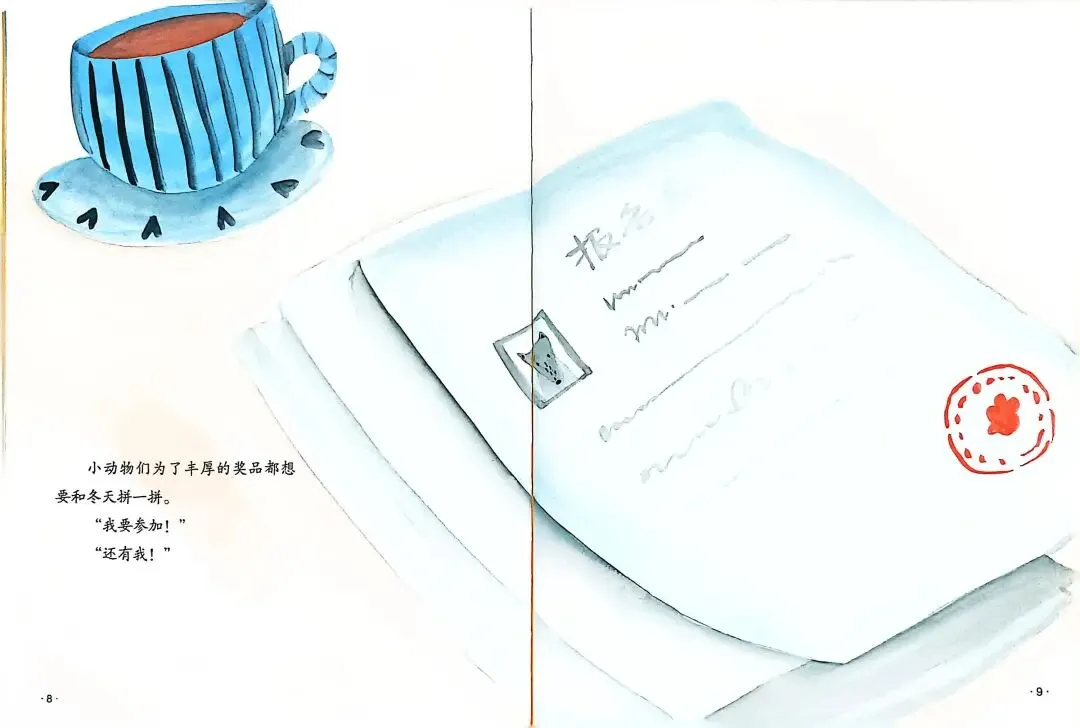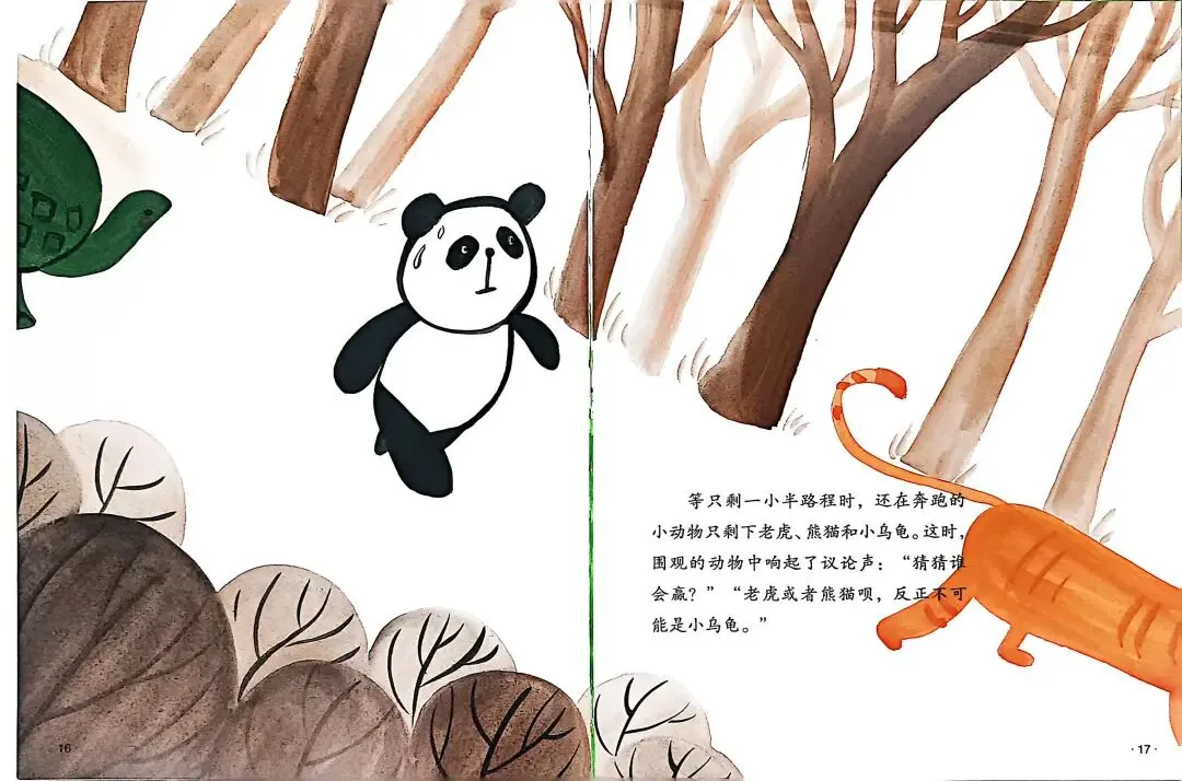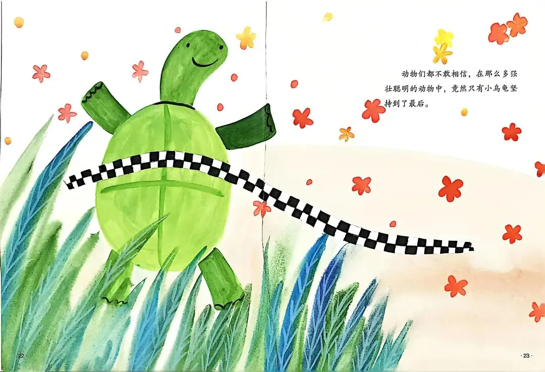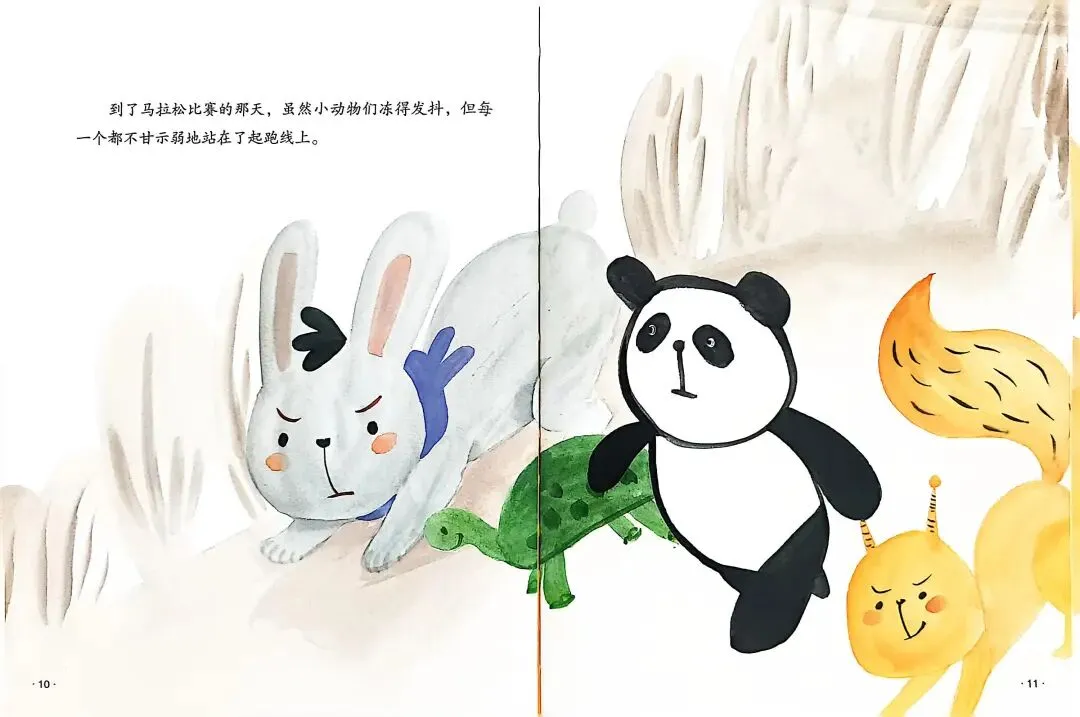 绘本以冬季森林为背景,通过一场特殊的“冬季马拉松大赛”,诠释了“坚持比速度更重要”的核心主题。寒冷的冬天里,森林之王狮子为唤醒躲在巢穴中冬眠的小动物,发起了一场以“香喷喷的香蕉饼干”为奖品的马拉松比赛。敏捷的小兔子、强壮的老虎、灵活的小松鼠纷纷参赛,起初凭借先天优势遥遥领先,却在途中因严寒、饥饿或畏难情绪陆续放弃。而看似最不起眼的小乌龟,背着重重的壳,一步一步坚定前行,即便手脚冻红、肚子咕咕叫,也始终默念“坚持就是胜利”,最终成为唯一抵达终点的胜利者。