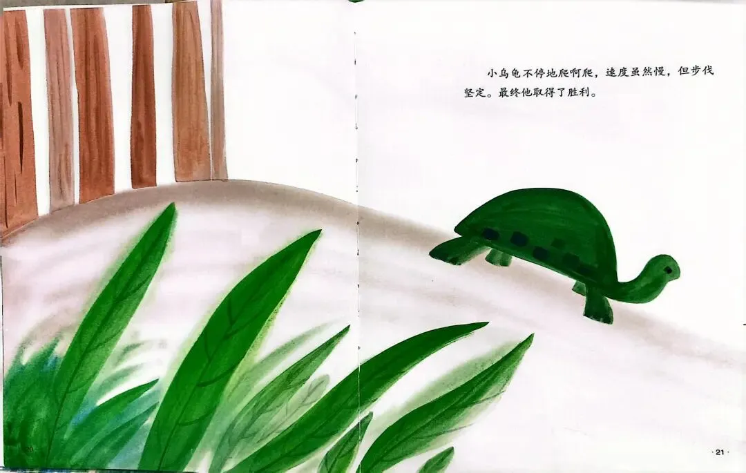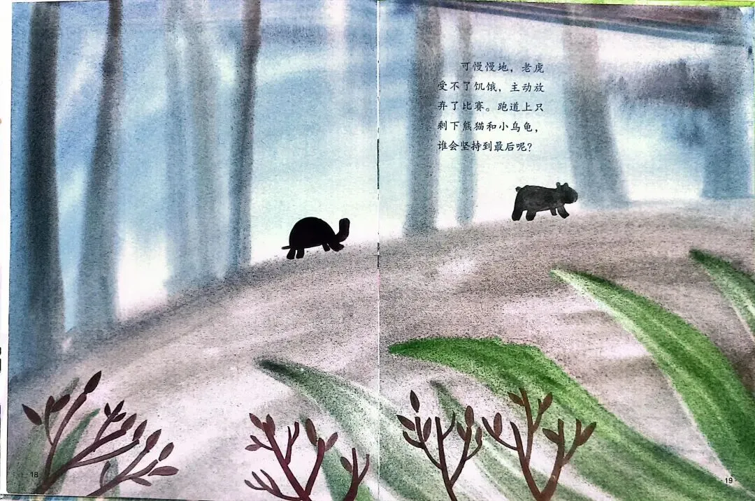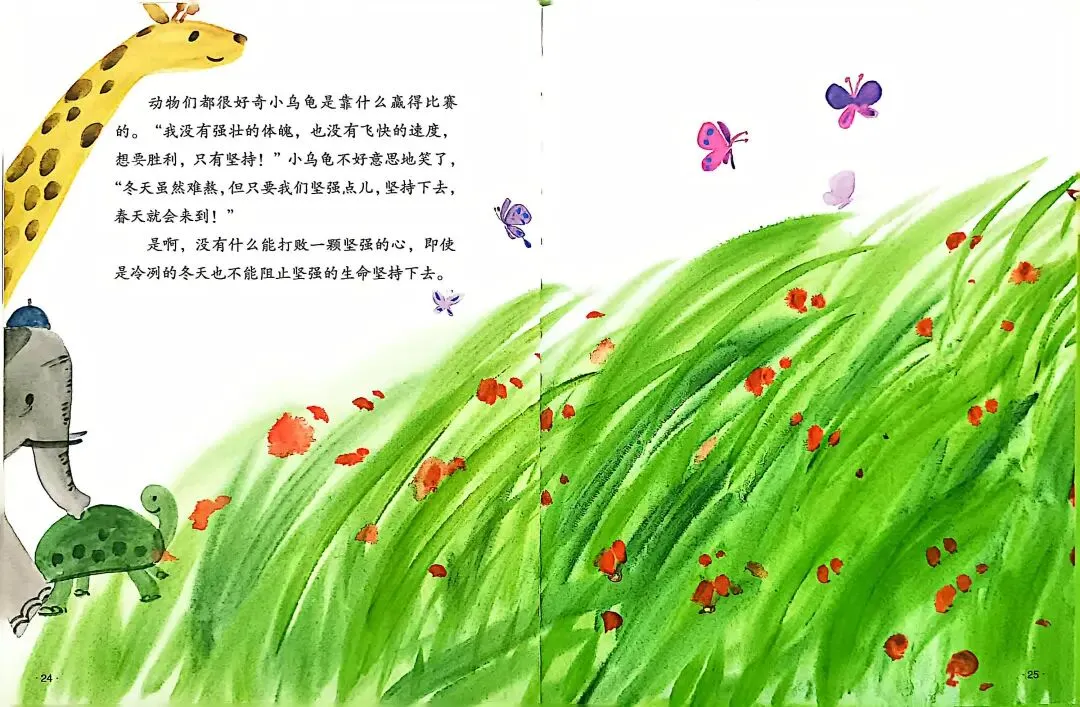 等只剩一小半路程时,还在奔跑的小动物只剩下老虎、熊猫、和小乌龟。这时,围观的动物中响起了议论声:“猜猜谁会赢?”“老虎或者熊猫呗,反正不可能是小乌龟。”可慢慢地,老虎受不了饥饿,主动放弃了比赛。跑道上只剩下熊猫和小乌龟,谁会坚持到最后呢?小乌龟不停地爬啊爬,速度虽然慢,但步伐坚定。最终他取得了胜利。动物们都不敢相信,在那么多强壮聪明的动物中,竟然只有小乌龟坚持到了最后。 动物们都很好奇小乌龟是靠什么赢得比赛的。“我没有强壮的体魄,也没有飞快的速度,想要胜利,只有坚持!”小乌龟不好意思地笑了,“冬天虽然难,但只要我们坚强点儿,坚持下去,春天就会来到!”