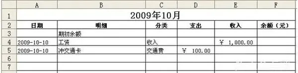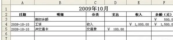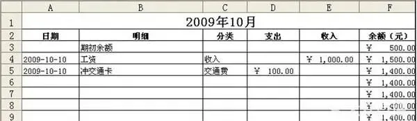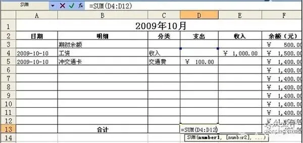 首先,第一次记账的时候,盘点你身上的现金(比如说500元),把这个数字打进F3里面,然后F4=F3+E4-D4 如下图: