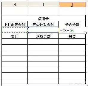 然后第三行的卡内余额下面一格(J4)设置公式=I4-H4 如下图: