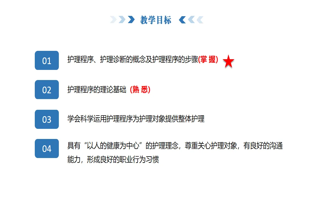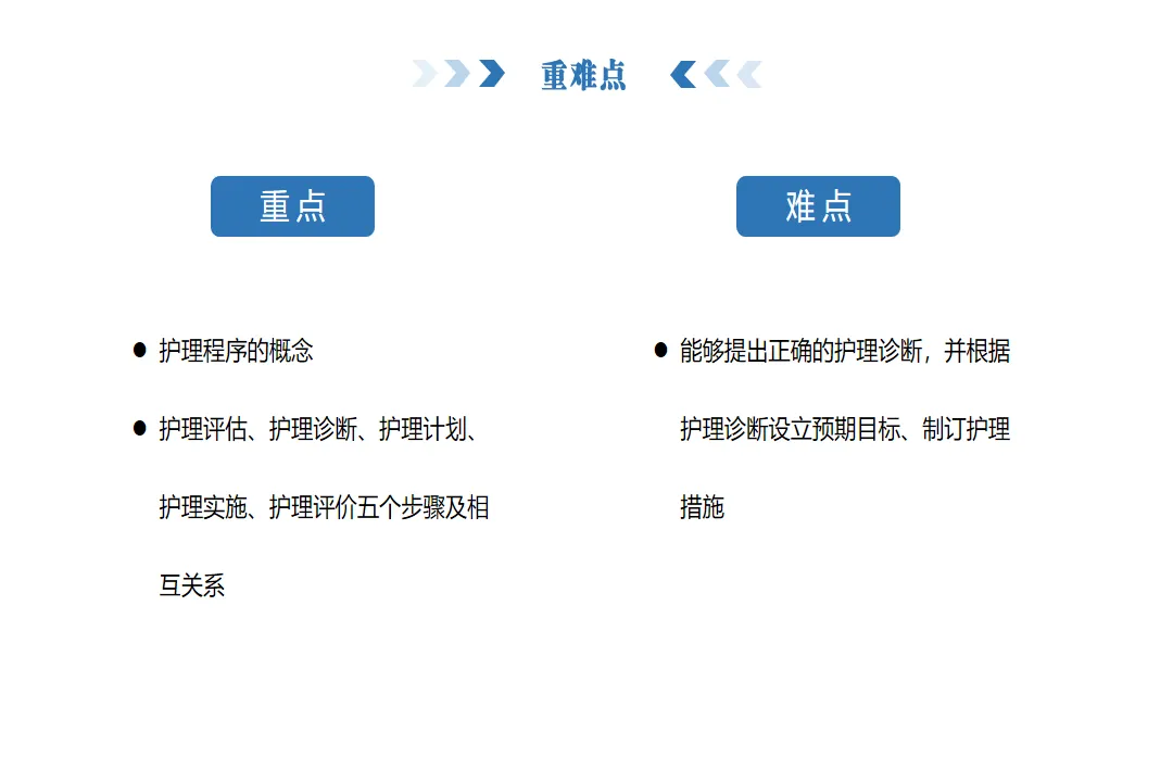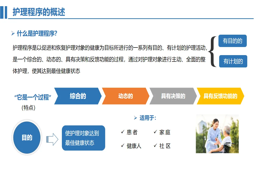 这份PPT是围绕国家卫生健康委员会“十四五”规划教材制作的,适配本科护理学类专业学习,不管是课堂听课、课后复习,还是备考刷题,都是绝佳的学习资料。它的主讲内容紧扣教学大纲,把护理程序的重点、难点拆解得明明白白,还标注了教学目标里的掌握、熟悉要点,让大家学习有方向,不用再盲目啃书。