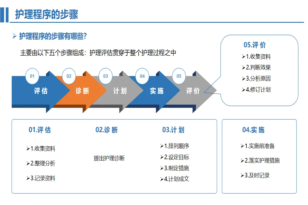 这份PPT的实用价值,用过就知道有多香!首先,它把护理程序的概述、发展背景、理论基础讲得通俗易懂,从海尔首次提出护理程序,到发展为如今的五个步骤,时间线清晰,帮你建立知识体系;其次,核心的护理程序五大步骤(评估、诊断、计划、实施、评价)被拆解成一个个小知识点,从资料收集的方法、护理诊断的类型与陈述,到护理计划的制定、护理评价的步骤,每个环节都有细节讲解和案例举例,比如PSE、PE的诊断陈述方式,首优、中优、次优问题的区分,一看就懂;