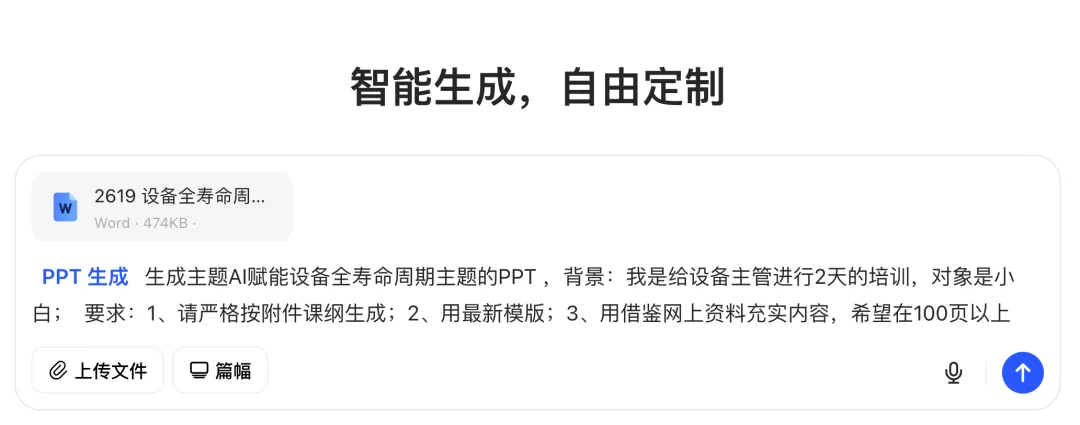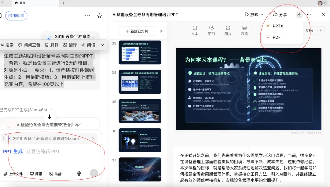 第三步:上传《AI赋能设备全寿命周期》的课纲,输入提示词:“