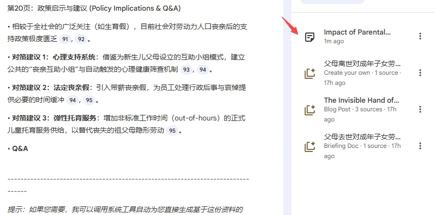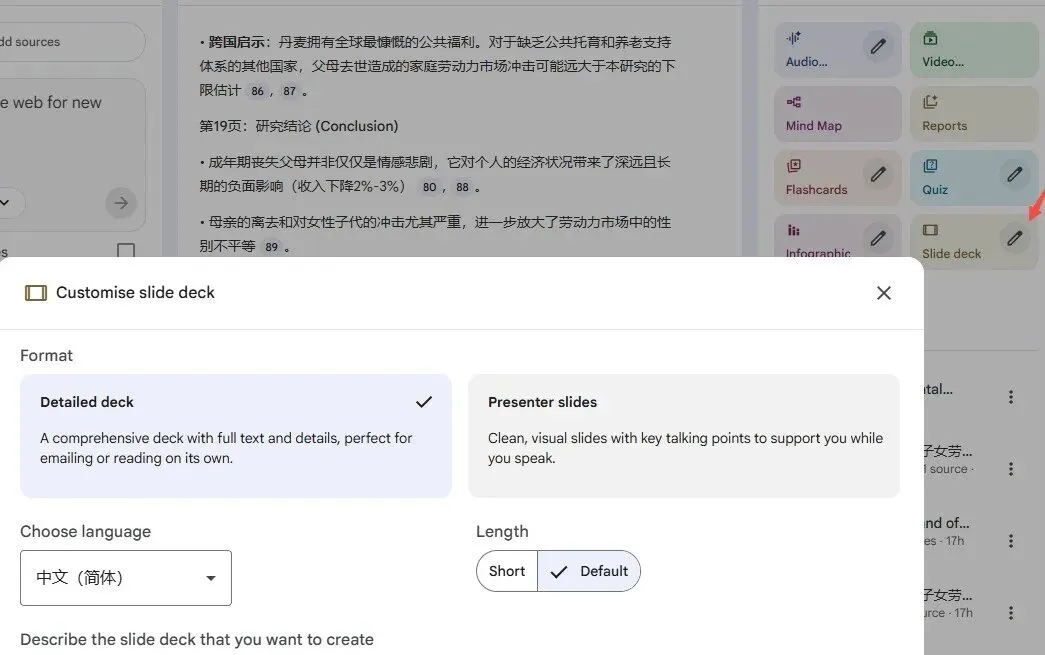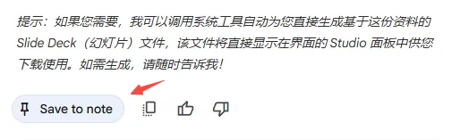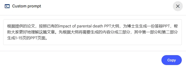 如果你现在还只会靠自己手工打磨PPT,那是真的out了!掌握好notebooklm,任何类型的PPT都不在话下!首先进入网址https://notebooklm.google.com/,把我们需要的文献上传上去。上传成功后,可以看到左边的source栏出现该文献。选择该文献后,在中间的对话框输入提示词“基于这篇文献,帮我生成一份20页的PPT大纲。我需要把这篇论文做成学术汇报风格的完整PPT,以便在公共场合展示我的研究。”后,等待结果。结果生成后,我们点击回答的右下方保存为笔记,然后看到右侧出现该笔记。接着再点击三个点,选择convert to source。之后,便能在右侧source栏看到该笔记。随后,我们选择这两个文档作为参考sources,点击生成幻灯片那栏的小铅笔。设置语言和时长以及提示词——“根据提供的论文,按照已有的impact of parental death PPT大纲,为博士生生成一份答辩PPT,帮助大家更好地理解这篇文章。先根据大纲将需要生成的内容分成三部分,其中第一部分和第二部分生成1-15页的PPT页面。”,直接点击生成即可。注意这里要求生成15页,是因为Notebooklm默认一次性只能生成15页。生成完成后,我们可以看到整个PPT是浅色背景,没有多余的花里胡哨,语言表达也精准无误。唯一直观的缺点,便是每个关键名词后都有一个括号英文注释。这一点,可以在提示词中要求不这么做。考虑到一次性只能生成15页,故而后续重复之前的动作,提示词换成“保持要求和风格一致,继续将第三部分的内容生成第16页到20页的PPT内容。”便可将剩下的内容生成完全。所以别再自己磨PPT了,交给notebooklm,分分钟搞定!