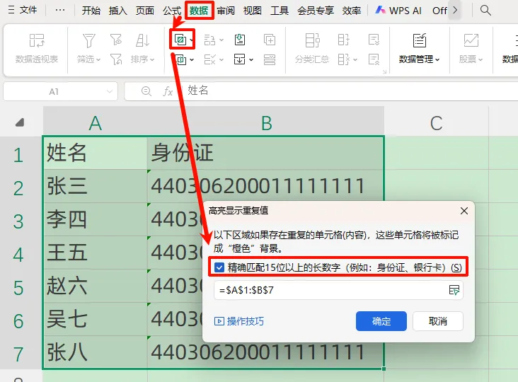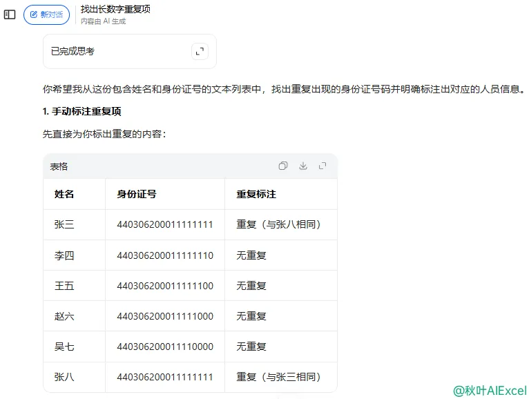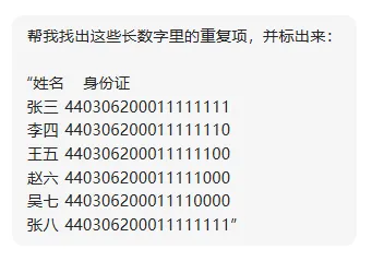 注意:公式中使用通配符「*」,是为了将数字格式的身份证转为文本格式进行计算。如果你是 WPS 用户,不用写公式,WPS 的【数据】选项卡,就自带精确匹配 15 以上的长数字的功能~❷ 点击【数据】选项卡-【重复项】-【设置高亮重复项(S)...】;❸ 勾选【精确匹配 15 为以上的长数字】-点击【确定】。这个方法确实很省事,但它有一个小问题:只能在 WPS 里用。那有没有一种方法:不用写公式,不受软件限制,还能处理大批量数据?把数据选中或复制,打开 AI 工具(比如豆包、Kimi),然后直接说一句话:不用记公式,也不挑软件,很多原本要花半小时的事情,现在几秒就能搞定。像身份证、订单号、设备编号这种超过 15 位的长数字核对,本质上就是一件重复、机械、容易出错的工作。以前我们只能靠人工,现在,其实完全可以交给工具:Excel 公式、WPS、AI(注意:用 AI 处理数据时,要选择正规工具,注意数据安全)。如果你经常在做表,其实会发现:很多加班,并不是因为事情多,而是因为——还在用人工方式解决本可以自动化的问题。如果你不想再被琐事缠身,真正实现高效办公;