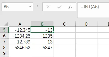 下图-12.345用INT函数之后取得的值为-13因为小于-12.345的最大整数为-13。