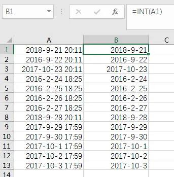 因为日期和时间的本质是数字,常规格式下日期就是整数。所以咱们可以用INT函数提取日期