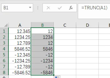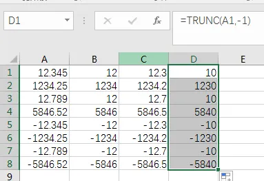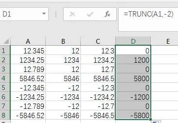 当负数的位数大于等于整数的位数时,则返回0,如下图TRUNC(12.789,-2)=0