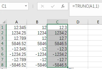 当第二参数不为0时,根据第二参数进行截尾。如第二参数为1时,保留小数点后一位,之后的全舍去,参数为2时保留小数点后两位,以此类推….