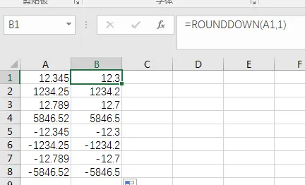 ROUNDDOWN向下舍,如下图:保留一位小数时,不管小数点第二位是几都舍去。第二参数的用法同ROUND函数一样。