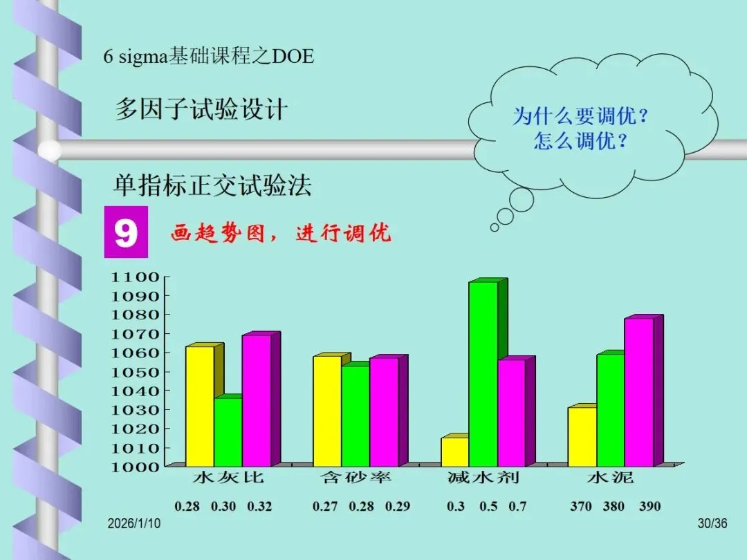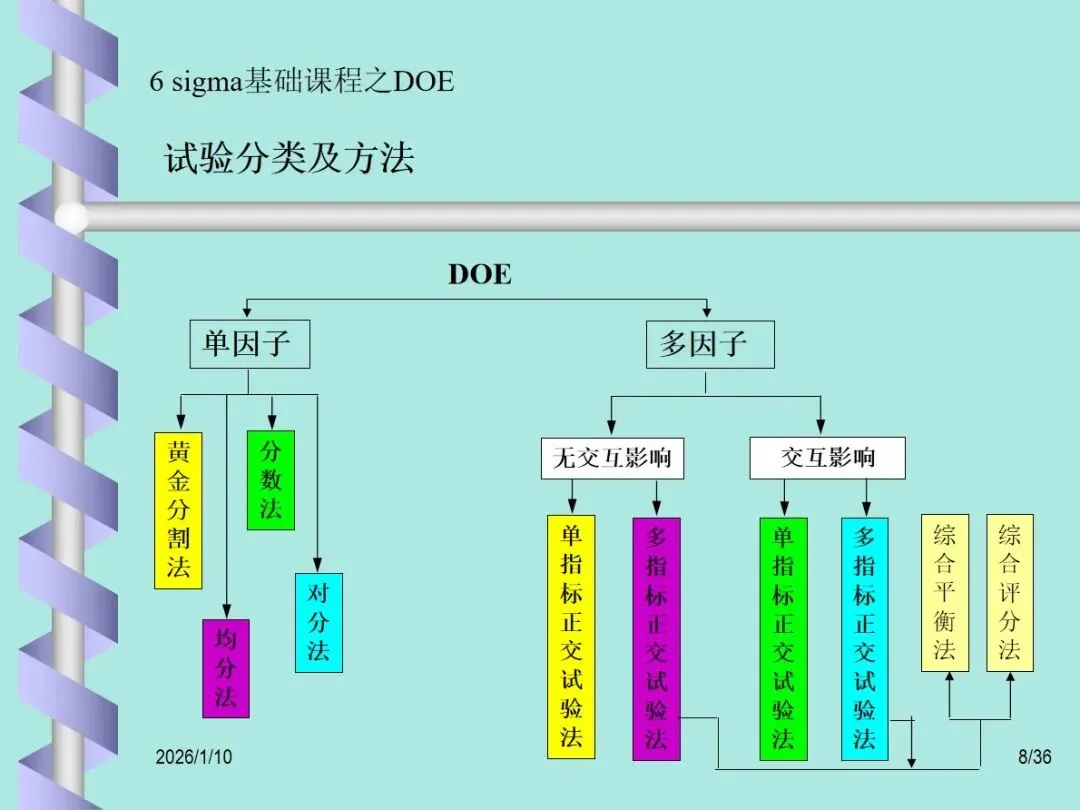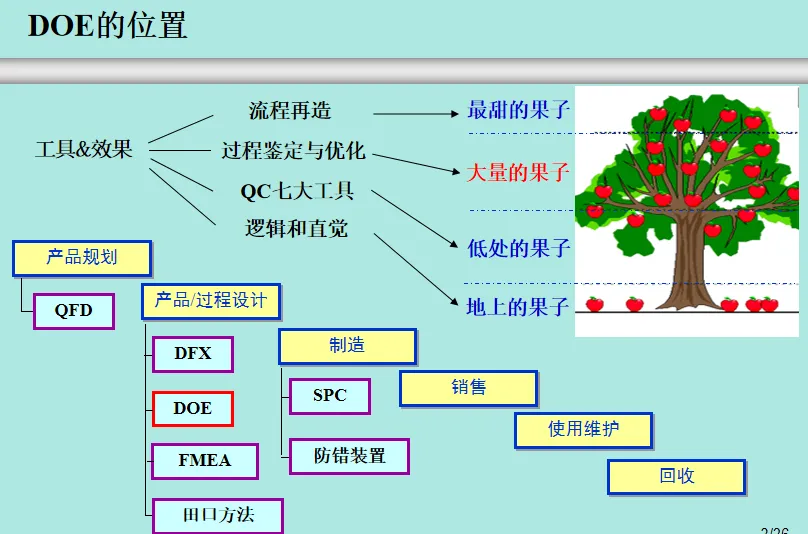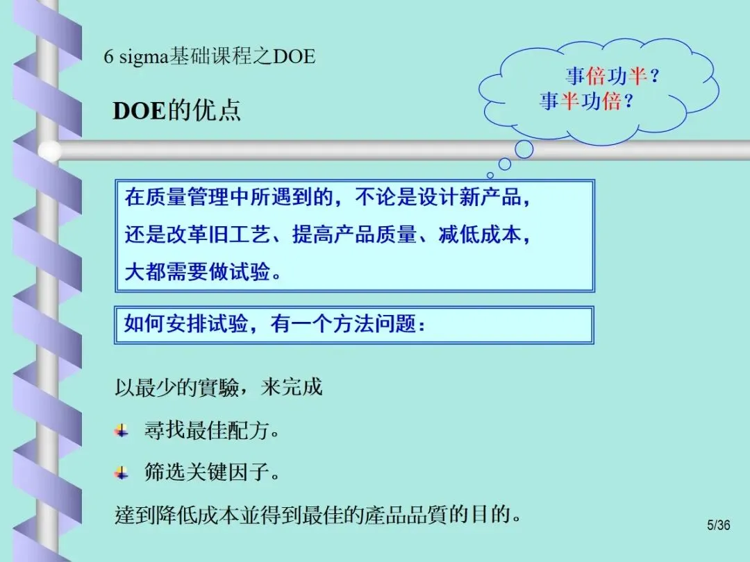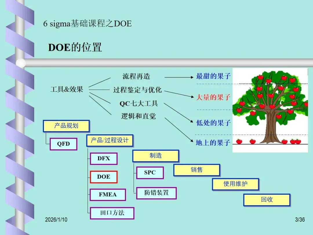 DOE 即试验设计,是 6Sigma 基础课程中的核心质量优化工具,主要应用在产品 / 过程设计、制造等阶段,和 QFD、FMEA、SPC 等工具配合使用,是过程鉴定与优化的关键手段,核心就是用最少的试验次数筛选关键影响因子、找到最优试验方案,最终实现降低成本、提升产品品质的目标。
