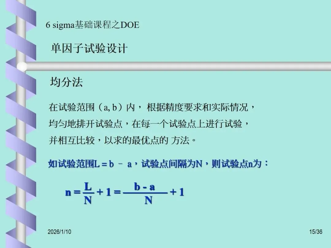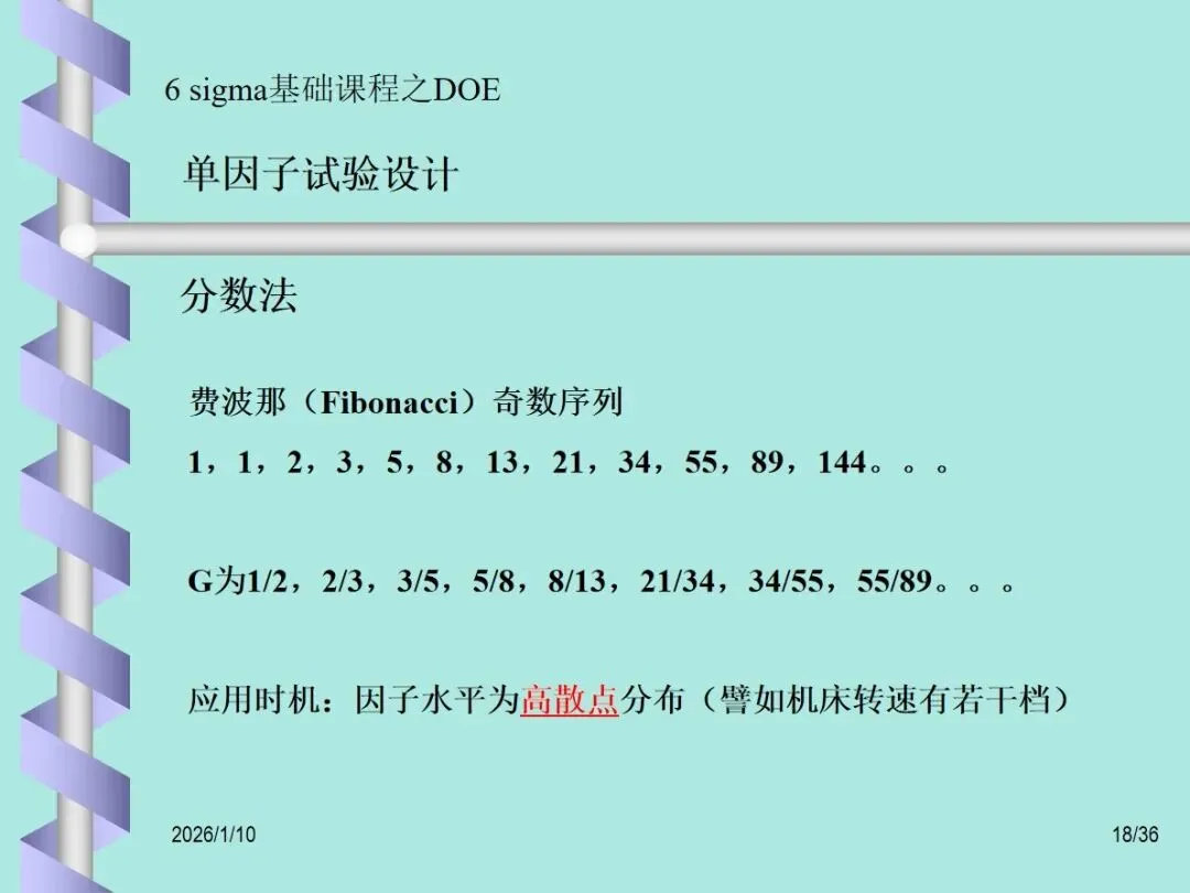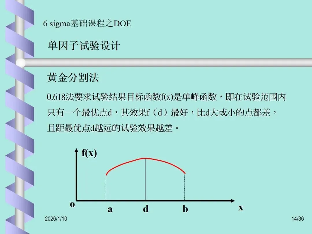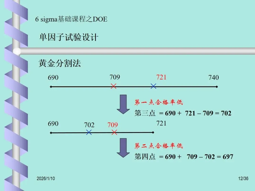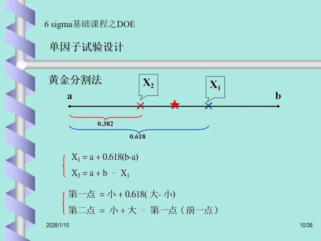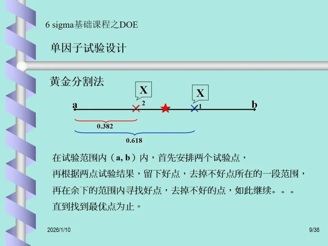 试验设计主要分单因子和多因子两类。单因子试验针对单一影响因子,常用方法有黄金分割法,适用于单峰函数,通过逐步缩窄试验范围找最优点;均分法是对试验范围做全面排查,精度由试验点数决定;分数法基于斐波那契序列,适合因子水平为离散点的情况。