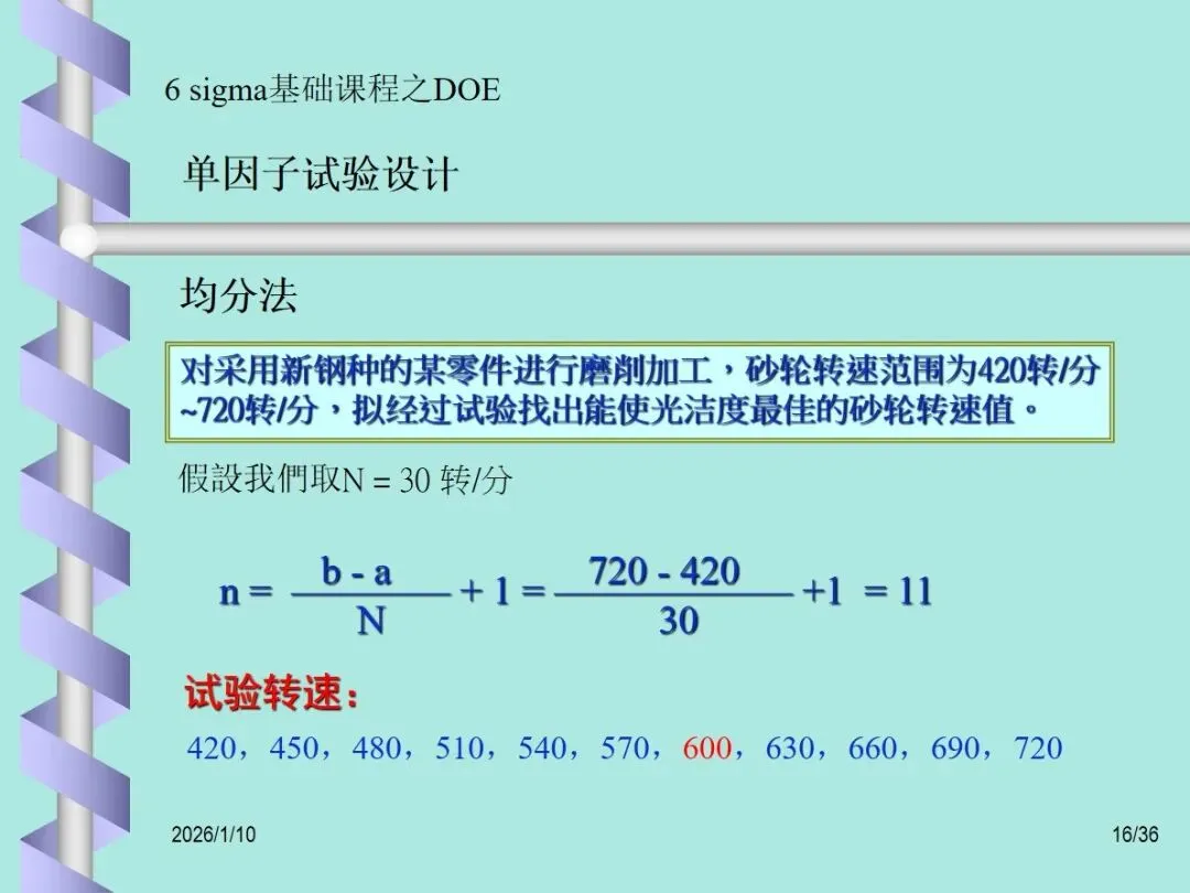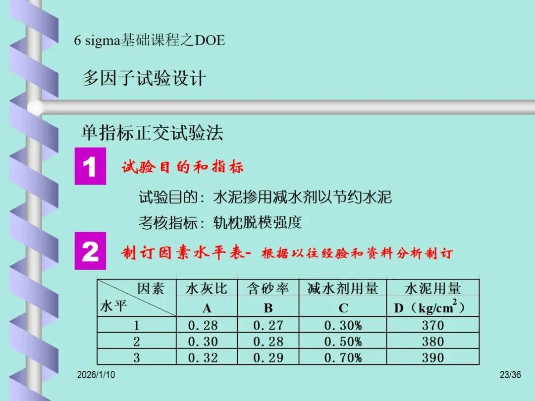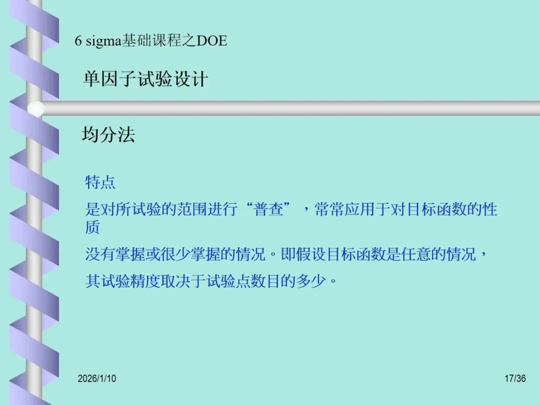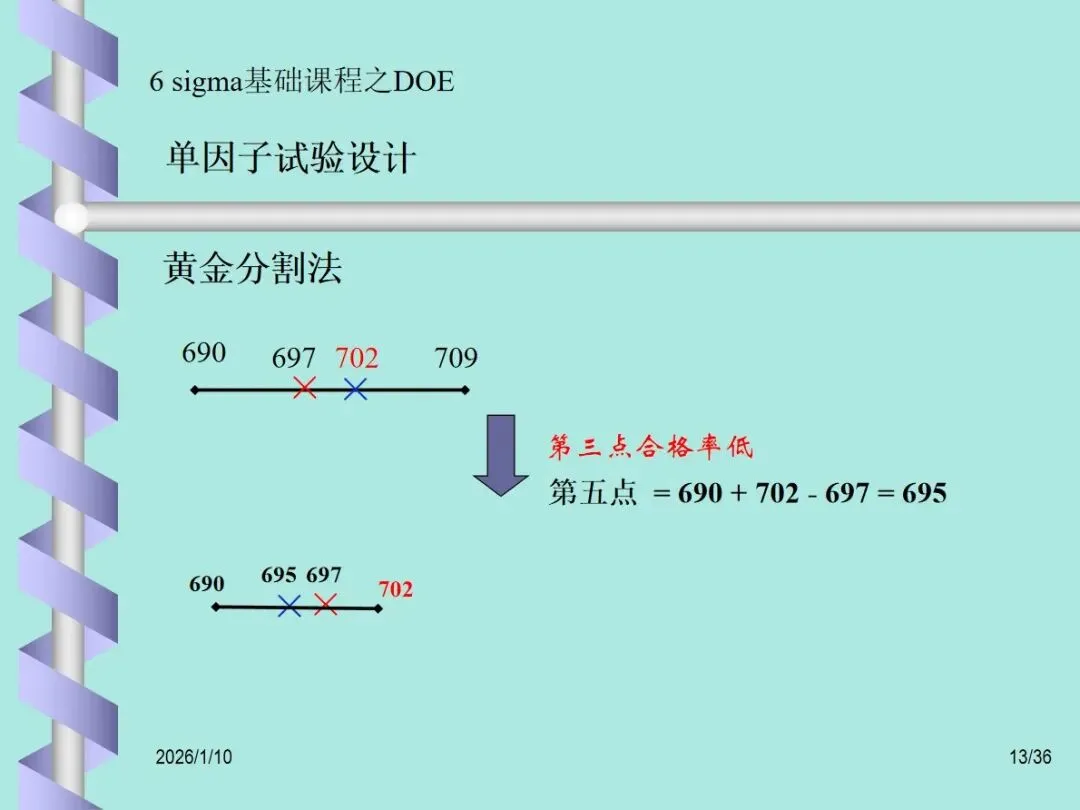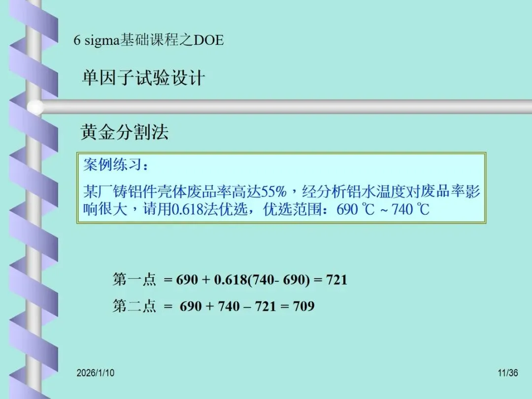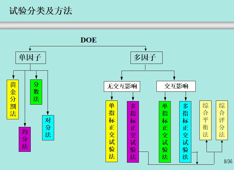 试验设计主要分单因子和多因子两类。单因子试验针对单一影响因子,常用方法有黄金分割法,适用于单峰函数,通过逐步缩窄试验范围找最优点;均分法是对试验范围做全面排查,精度由试验点数决定;分数法基于斐波那契序列,适合因子水平为离散点的情况。