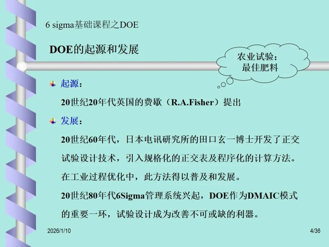 DOE 最早由英国的费歇在 20 世纪 20 年代提出,到 60 年代,日本的田口玄一博士开发出正交试验设计技术,让这一方法在工业过程优化中得到普及;80 年代 6Sigma 管理体系兴起后,DOE 融入 DMAIC 模式,成为质量改善中不可或缺的方法。