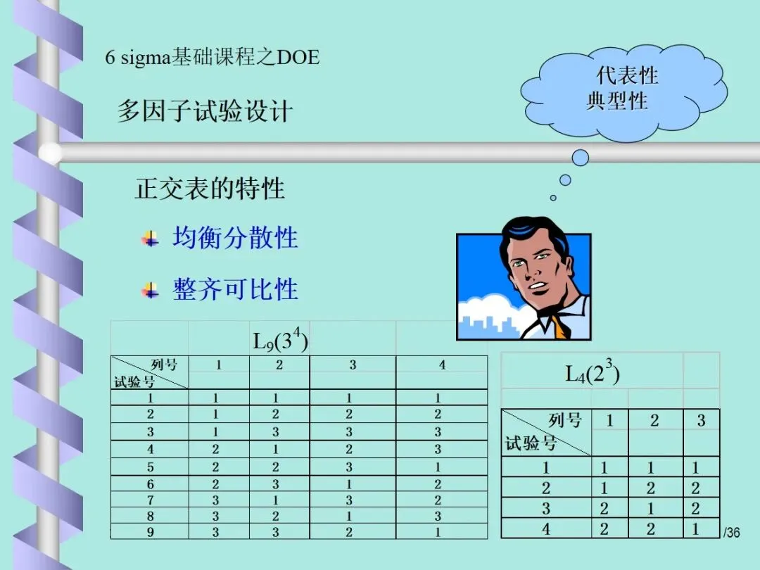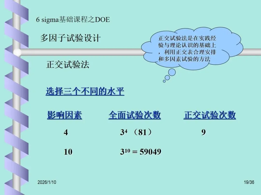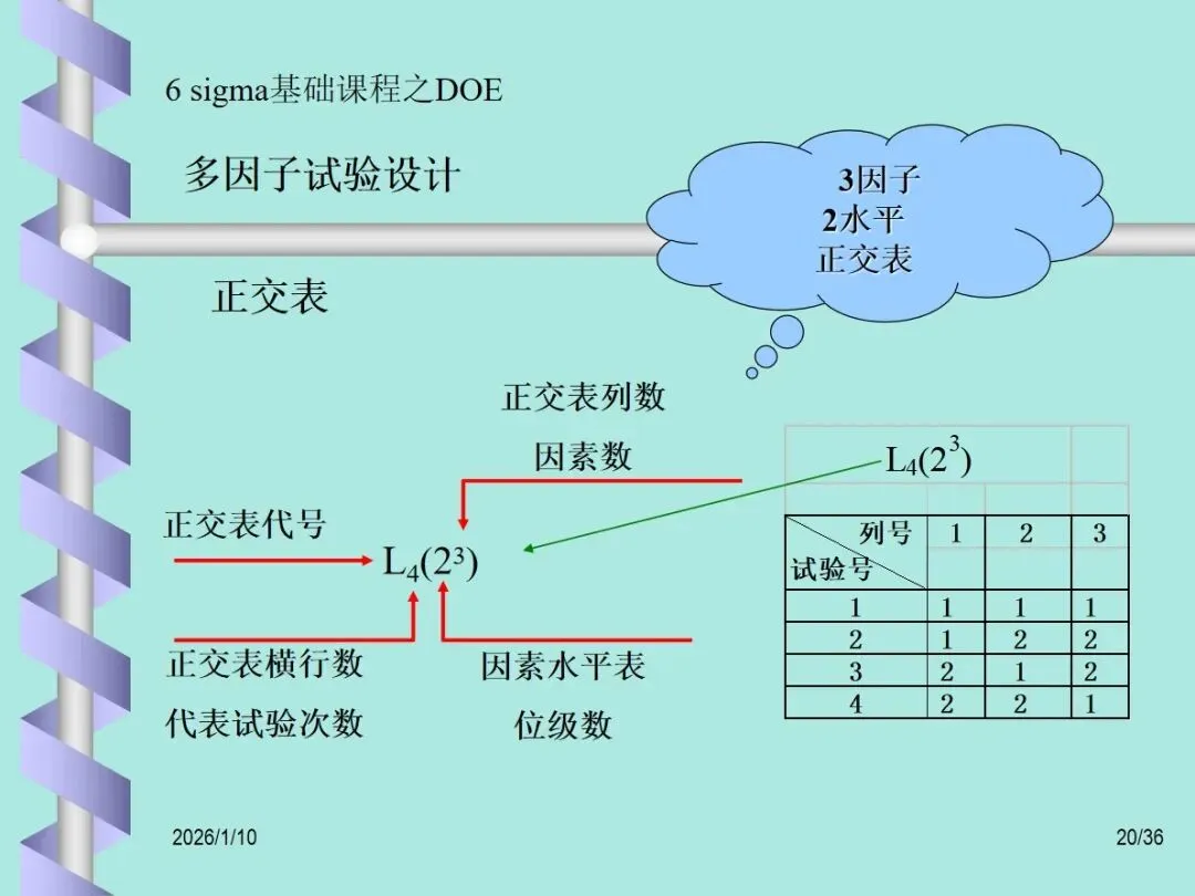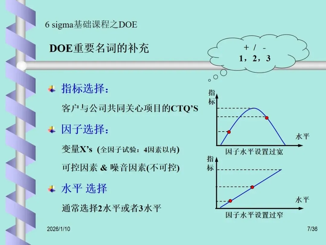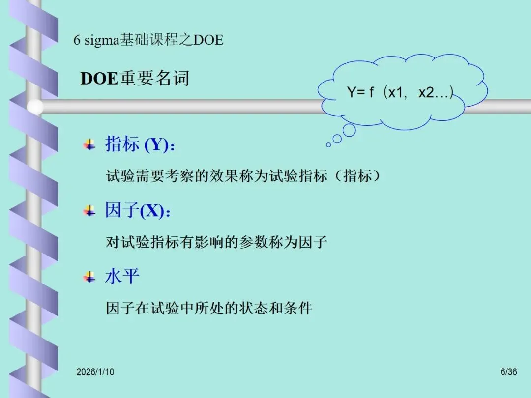 学习 DOE 首先要掌握三个核心名词:一是指标 Y,也就是试验要考察的效果,一般选客户和公司共同关注的 CTQ’S;二是因子 X,指对试验指标有影响的参数,分可控因素和不可控的噪音因素,全因子试验一般适用于 4 个因素以内的场景;三是水平,即因子在试验中所处的状态和条件,常用 2 水平或 3 水平,水平设置过宽或过窄都会影响试验结果,三者的核心关系为 Y=f(x1,x2…)。