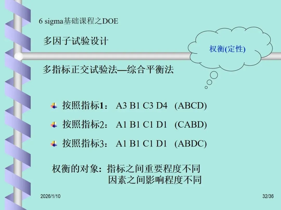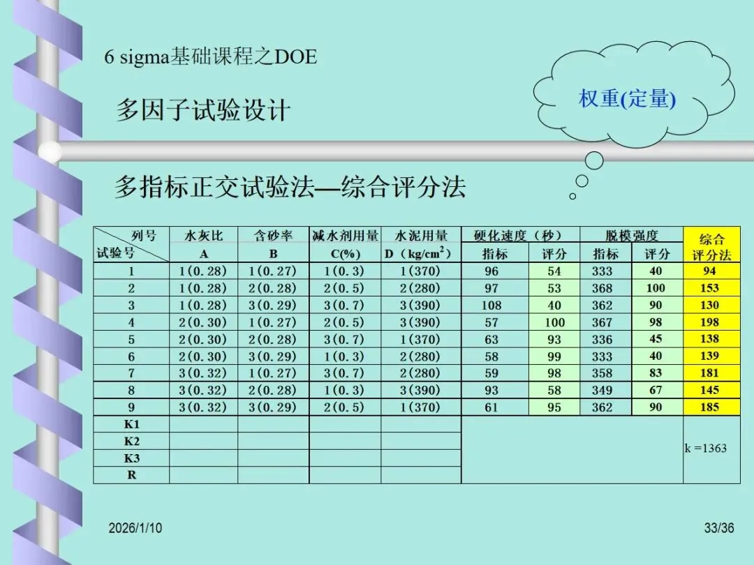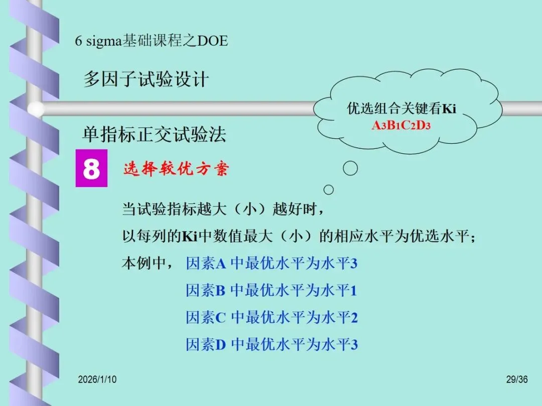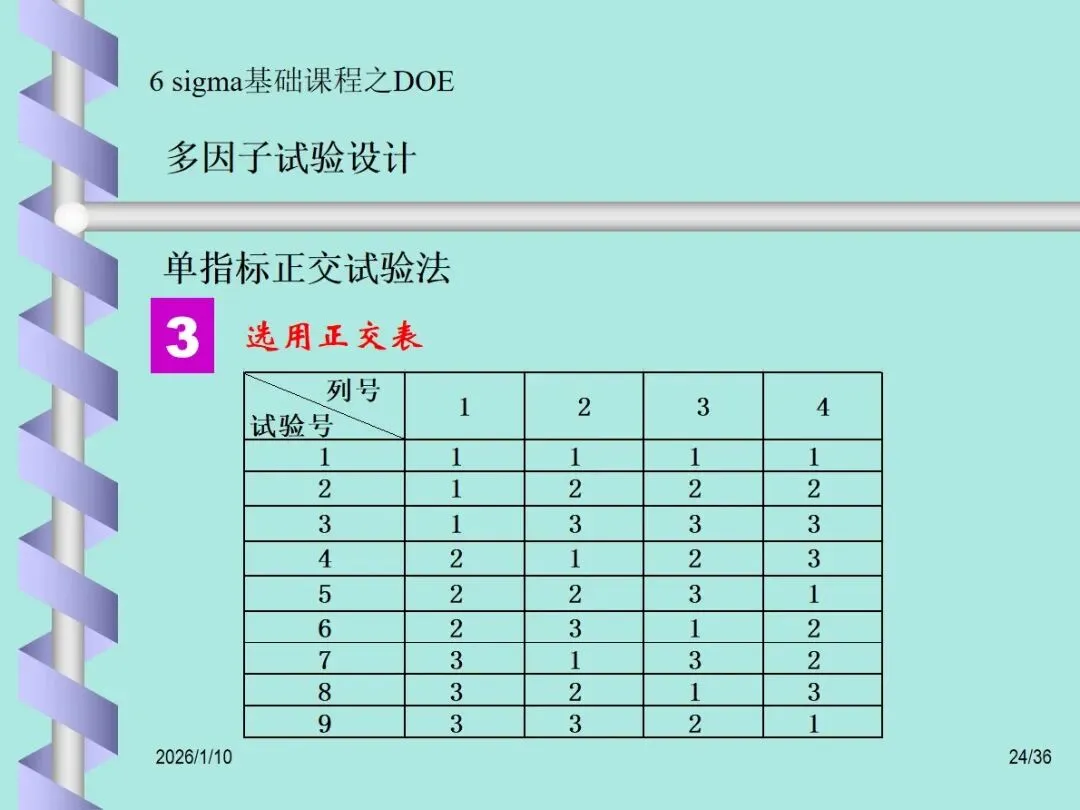 多因子试验的核心是正交试验法,能大幅减少试验次数,比如 3 水平 4 因子全面试验需 81 次,正交试验仅需 9 次。正交表有均衡分散性和整齐可比性两大特性,代号如 L4 (2³),依次代表试验次数、水平数、因子数。单指标正交试验通过极差分析计算 Ki 和 R 值,R 值越大,因子对指标的影响越显著,以此确定主次因子和最优水平;多指标试验可通过综合平衡法定性权衡,或综合评分法定量赋权选优,若因子间存在相互影响,需采用交互作用正交试验法。