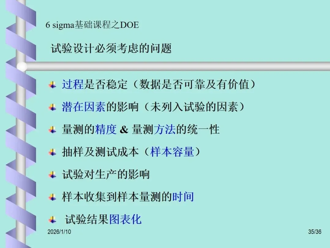 此外,设计试验时还需综合考虑过程稳定性、潜在因素影响、量测精度与方法统一性、试验成本及对生产的影响等问题,确保试验数据可靠、结果有实际应用价值。