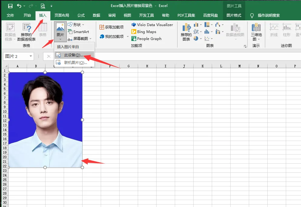 开启Excel软件,正式开启证件照换底色之旅。点击菜单栏里的“插入”选项,在下拉菜单中选择“图片”,接着点击“此设备”。在弹出的文件选择窗口中,精准定位到需要处理的证件照文件,点击打开,证件照便成功插入到Excel表格之中。