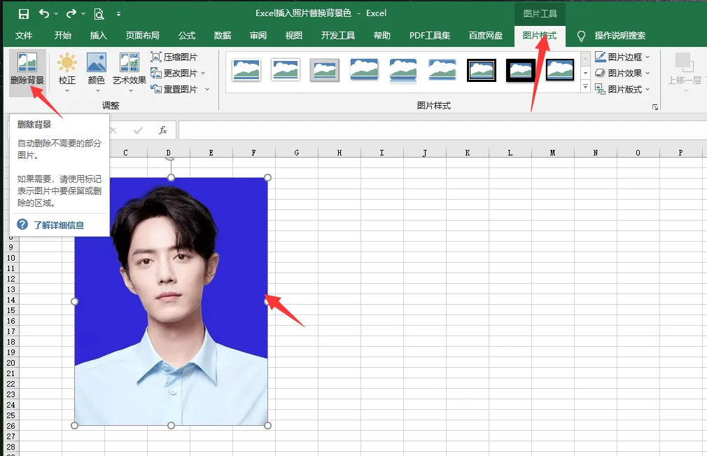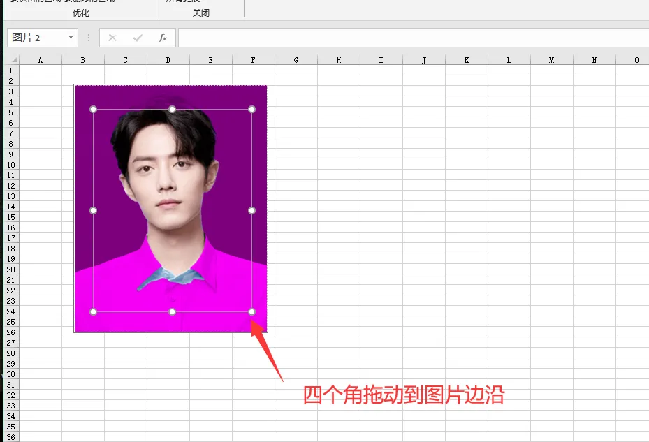 此时,图片周围会出现一个矩形框体,这是Excel自动识别出的需删除的背景区域。不过,Excel的自动识别可能存在偏差,这就需要手动对背景框体进行调整。