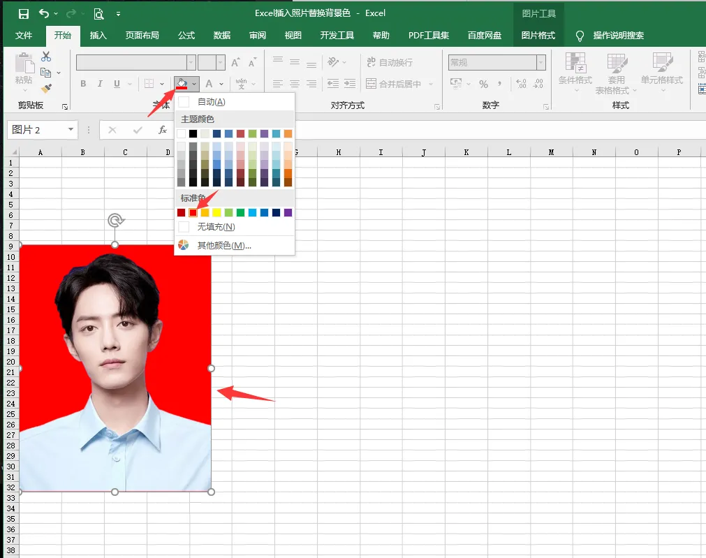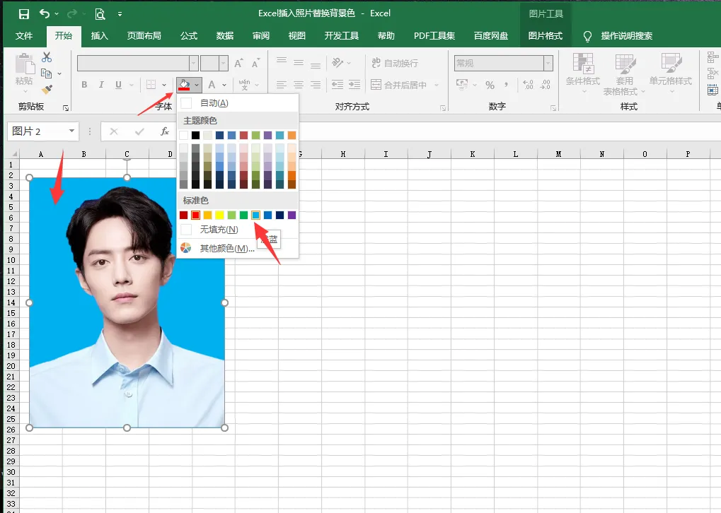 删除背景后,就可以为证件照更换新的背景颜色了。点击菜单栏中的“开始”选项,在下拉菜单中找到“字体颜色”或类似选项,不同版本的Excel可能略有差异,但功能大同小异。
