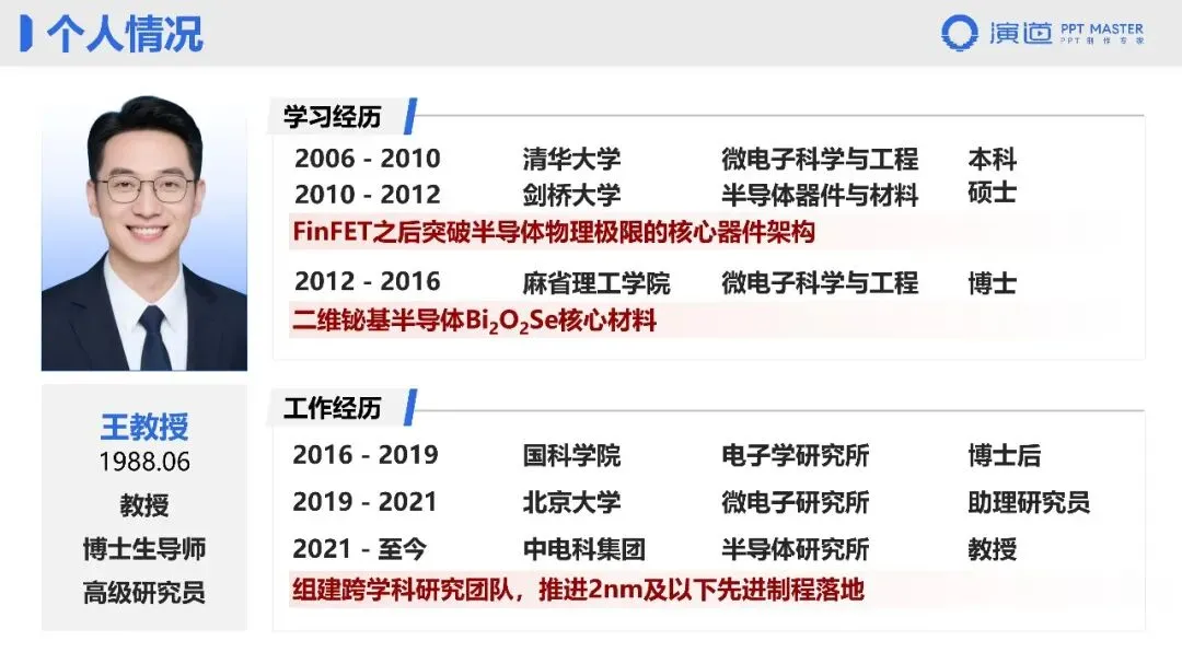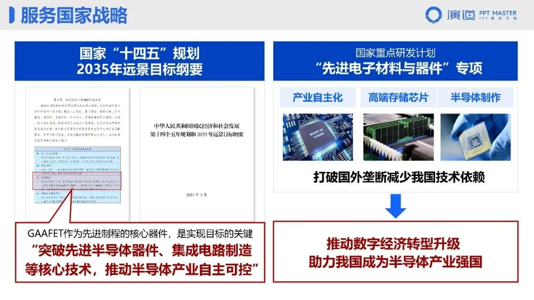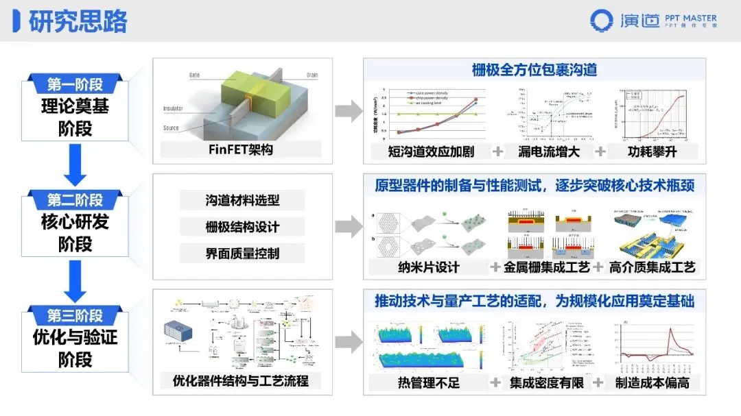 PPT 以 “研究思路 — 核心创新 — 战略价值” 为主线,先明确从 FinFET 架构瓶颈到 GAAFET 突破的三阶段实施路径,再从二维半导体与环栅异质集成、晶圆级单片三维集成两大维度呈现原创突破,最后紧扣国家 “十四五” 规划与重点研发计划,凸显项目的战略意义,逻辑清晰、体系完整,充分体现青拔人才的科研前瞻性与系统性。