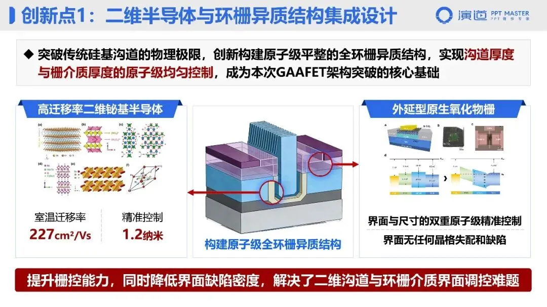 二维半导体与环栅异质结构集成设计:突破传统硅基沟道的物理极限,创新构建原子级平整的全环栅异质结构。通过高迁移率二维铋基半导体(室温迁移率 227 cm²/Vs,精准控制至 1.2 纳米)与外延型原生氧化物栅(界面无任何晶格失配和缺陷),实现沟道厚度与栅介质厚度的原子级均匀控制,提升栅控能力的同时降低界面缺陷密度,解决了二维沟道与环栅介质界面调控难题。