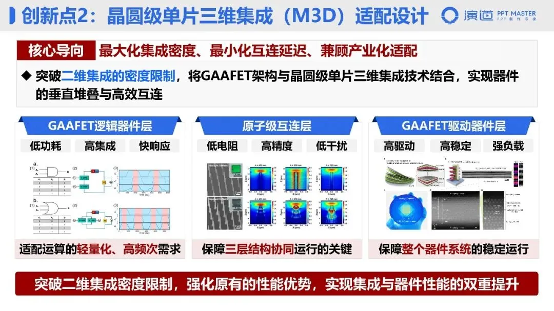 晶圆级单片三维集成(M3D)适配设计:突破二维集成的密度限制,将 GAAFET 架构与晶圆级单片三维集成技术结合,实现器件的垂直堆叠与高效互连。通过 GAAFET 逻辑器件层(低功耗、高集成、快响应)、原子级互连层(低电阻、高精度、低干扰)、GAAFET 驱动器件层(高驱动、高稳定、强负载)的协同设计,在最大化集成密度、最小化互连延迟的同时兼顾产业化适配,实现集成与器件性能的双重提升。