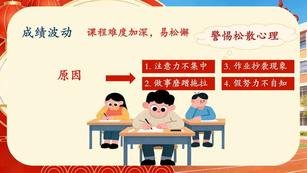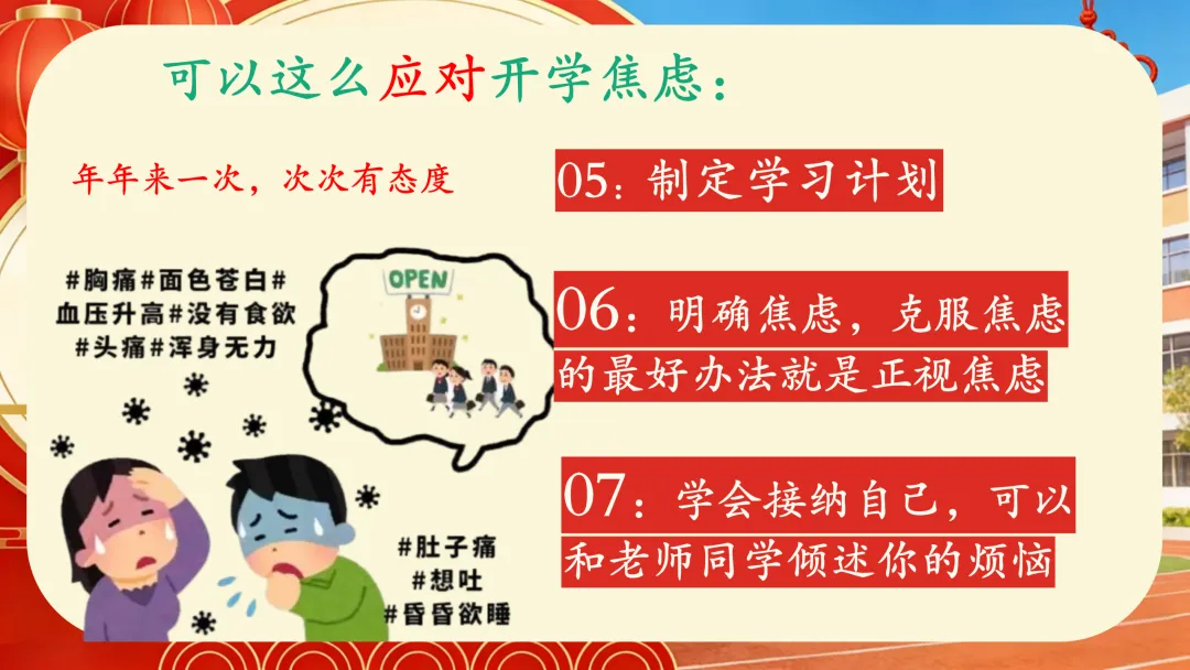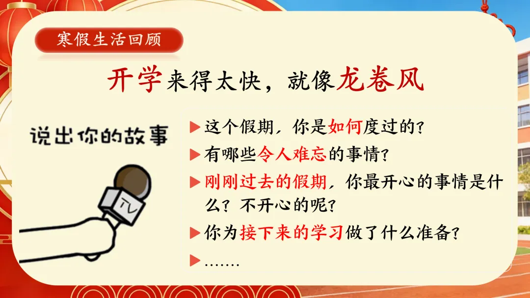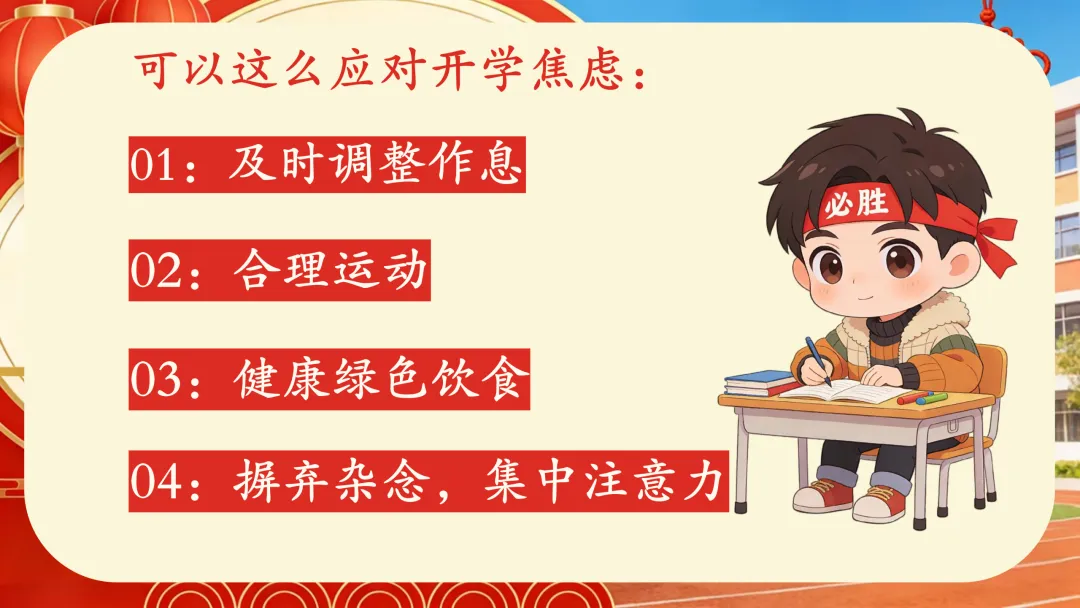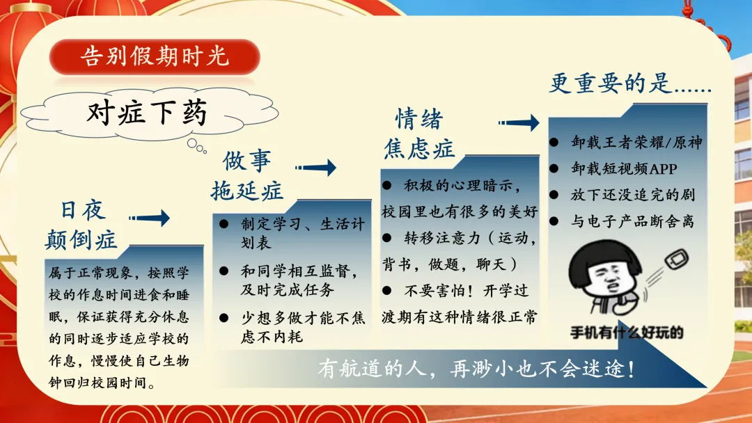 从寒假生活趣味回顾切入,用学生熟悉的假期场景和开学焦虑症状引发共鸣,再针对性给出作息调整、拖延症克服、电子产品断舍离等收心妙招,轻松引导学生告别假期状态。