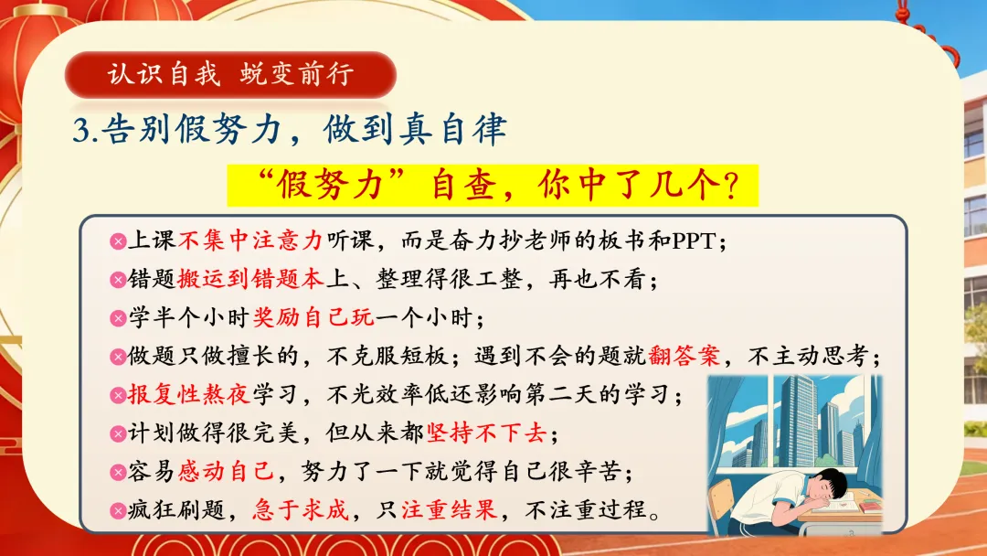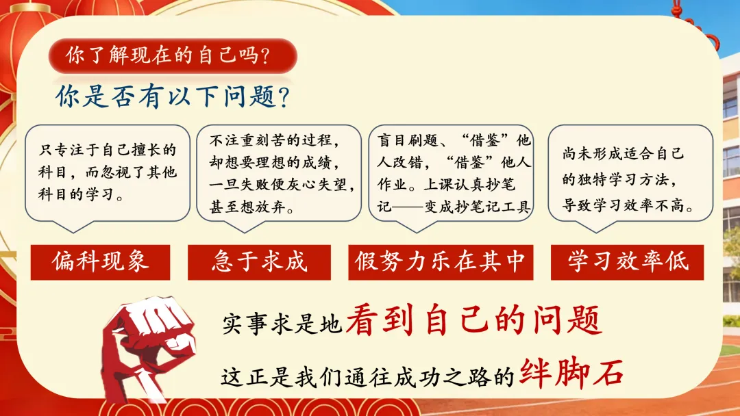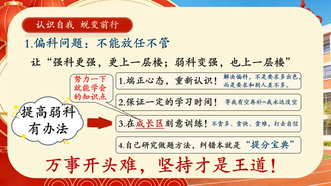 针对学生偏科、假努力、学习效率低等常见问题,ppt也给出了具体解决方法,搭配时间管理四象限法则、班主任暖心寄语,既有方法指导,又有情感激励,让学生快速收心