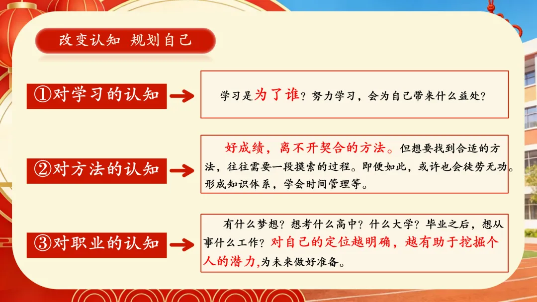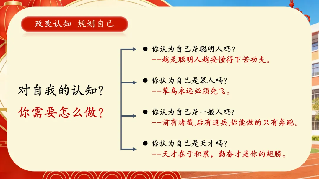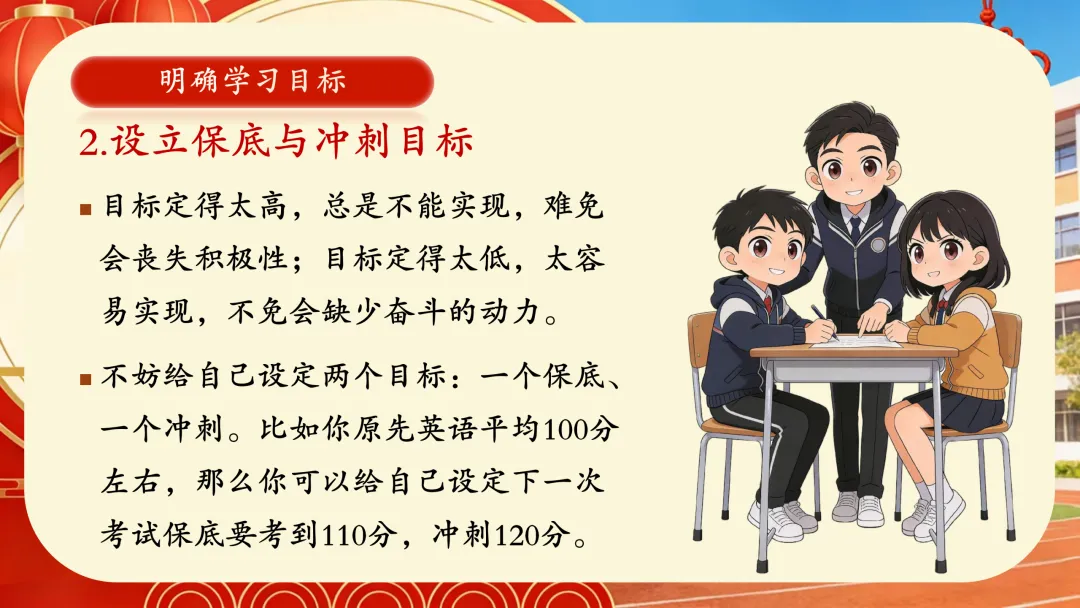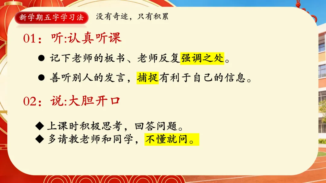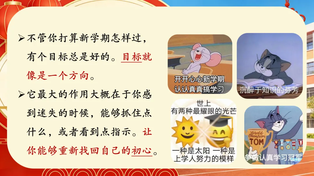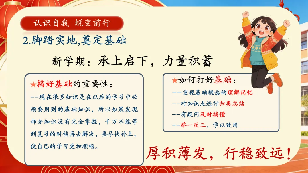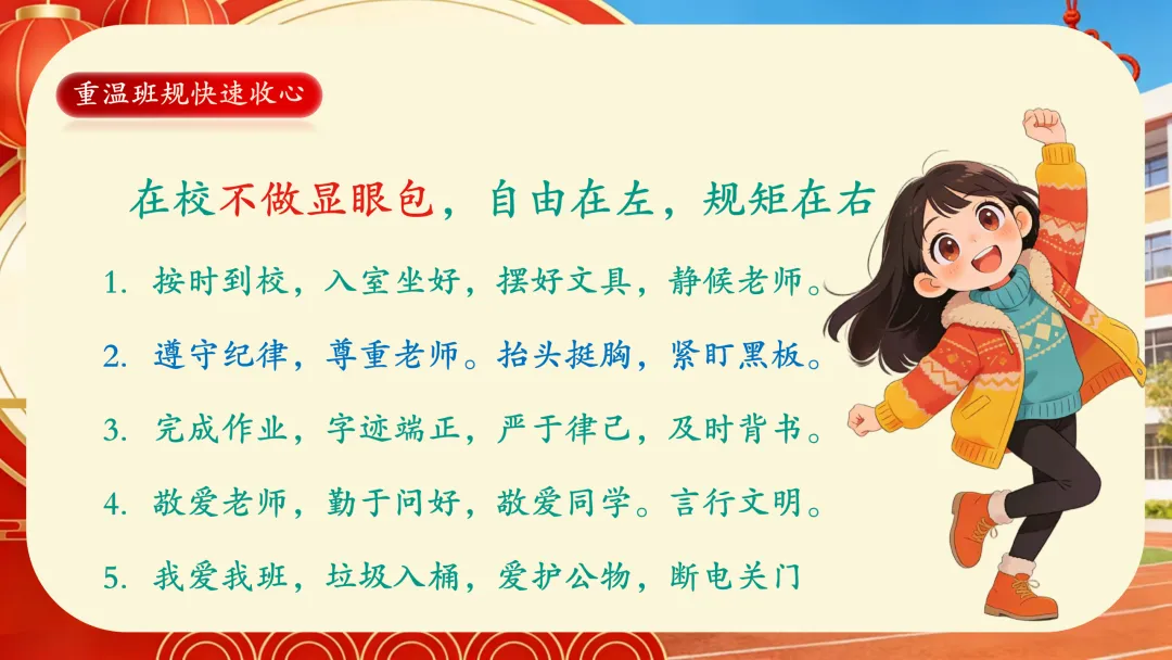 同时设置自我诊断、新学期宣言书、学习目标制定等互动环节,兼顾趣味性与实用性,还加入班规重温、校园安全、五字学习法等内容,全方位助力学生快速进入学习状态。