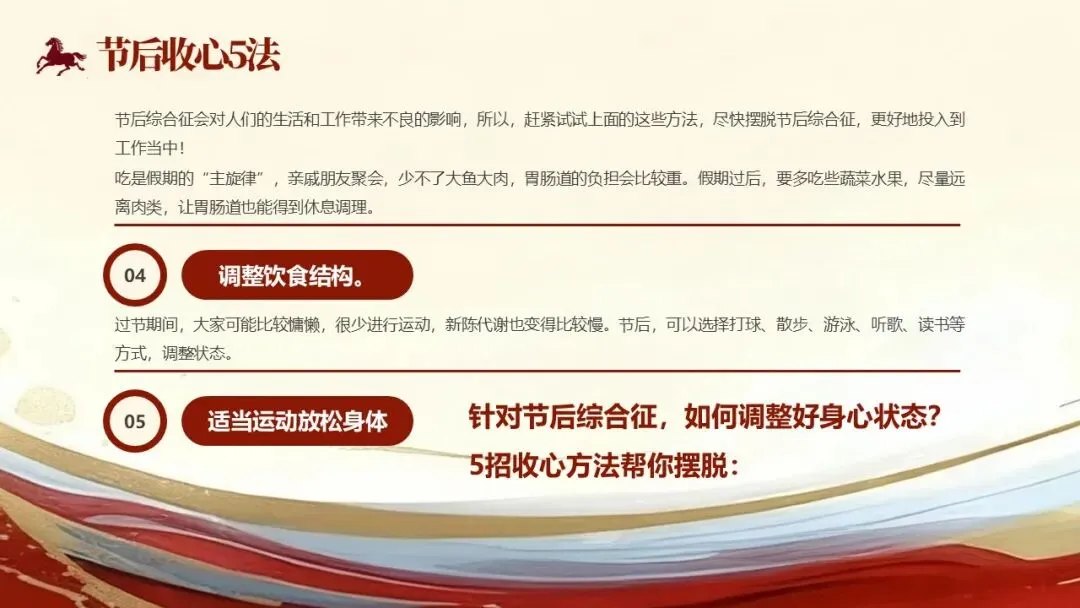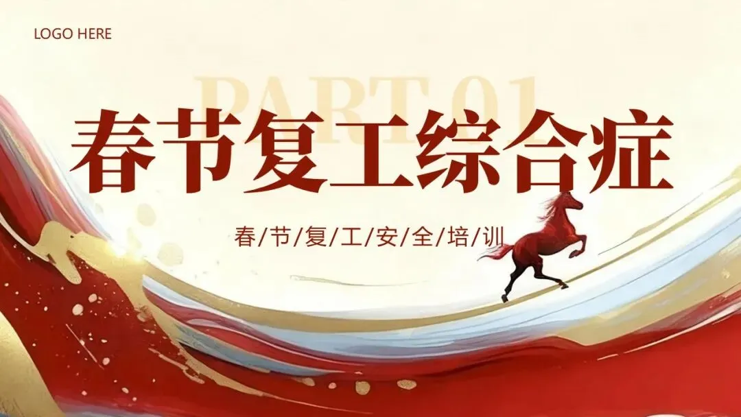 最近很多企业都在陆陆续续的迎来了节后开工,节后开工仪式相关的PPT也是很多老师一直在咨询我的需求,这次就给大家带来一款马年主题风格的春节节后开工第一课的PPT模版,有需要组织马年春节节后开工仪式的老师,都可以拿来参考借鉴一下,做好节后开工第一课的活动,对于鼓舞员工士气,提高公司业绩来说,都非常有意义,也祝愿大家都能够在马年工作顺利、多多发大财!!!01 春节复工综合症