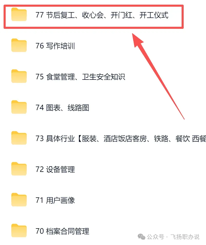 在编号77的文件夹里,名为"节后复工、收心会、开门红、开工仪式"的文件夹里,就有,大家对着文件预览图查找即可,预览图名称和文件的名称是对应的