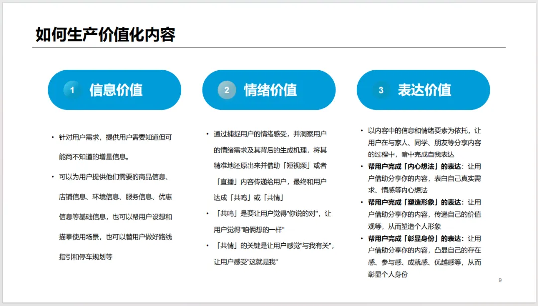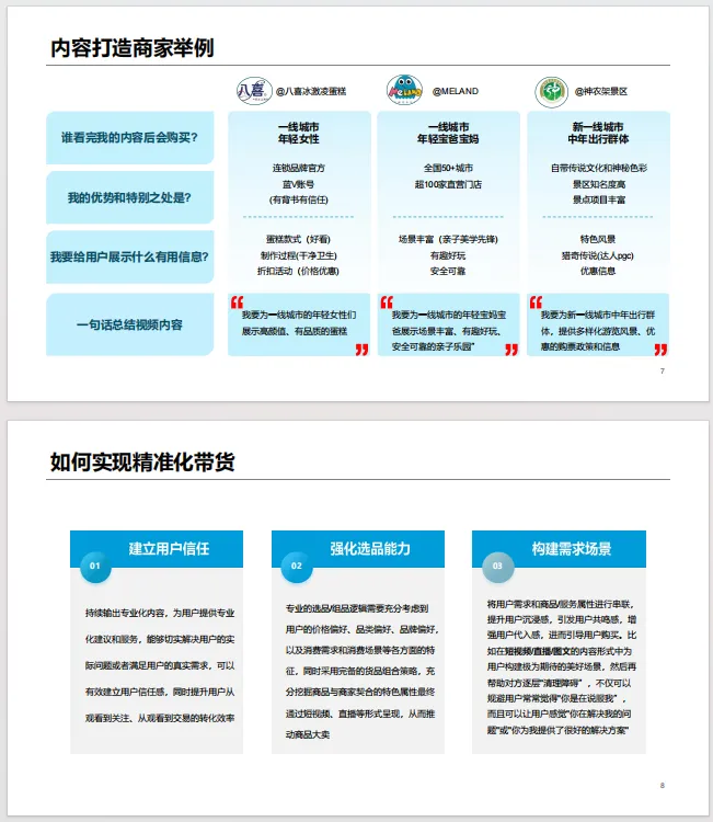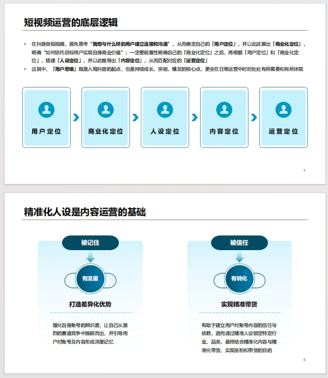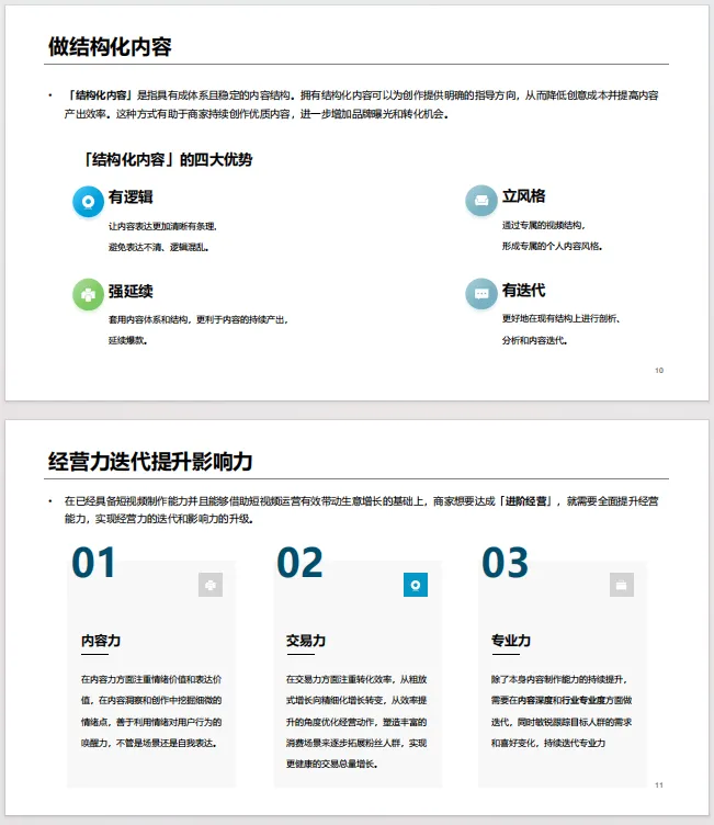 运营底层逻辑强调以用户思维为起点,通过明确用户定位、商业化定位、人设定位、内容定位和运营定位的递进关系,构建精准化人设。差异化人设有助于建立辨识度、获取用户信任并实现精准带货。内容生产需提供信息价值(如商品、优惠、场景信息)、情绪价值(引发共鸣或共情)和表达价值(帮助用户完成内心想法、塑造形象或彰显身份的分享)。采用结构化内容可提升逻辑性、延续性、风格统一性和迭代效率。经营力的进阶需迭代内容力(挖掘情绪与表达)、交易力(提升转化效率与拓展场景)和专业力(深化行业洞察)。